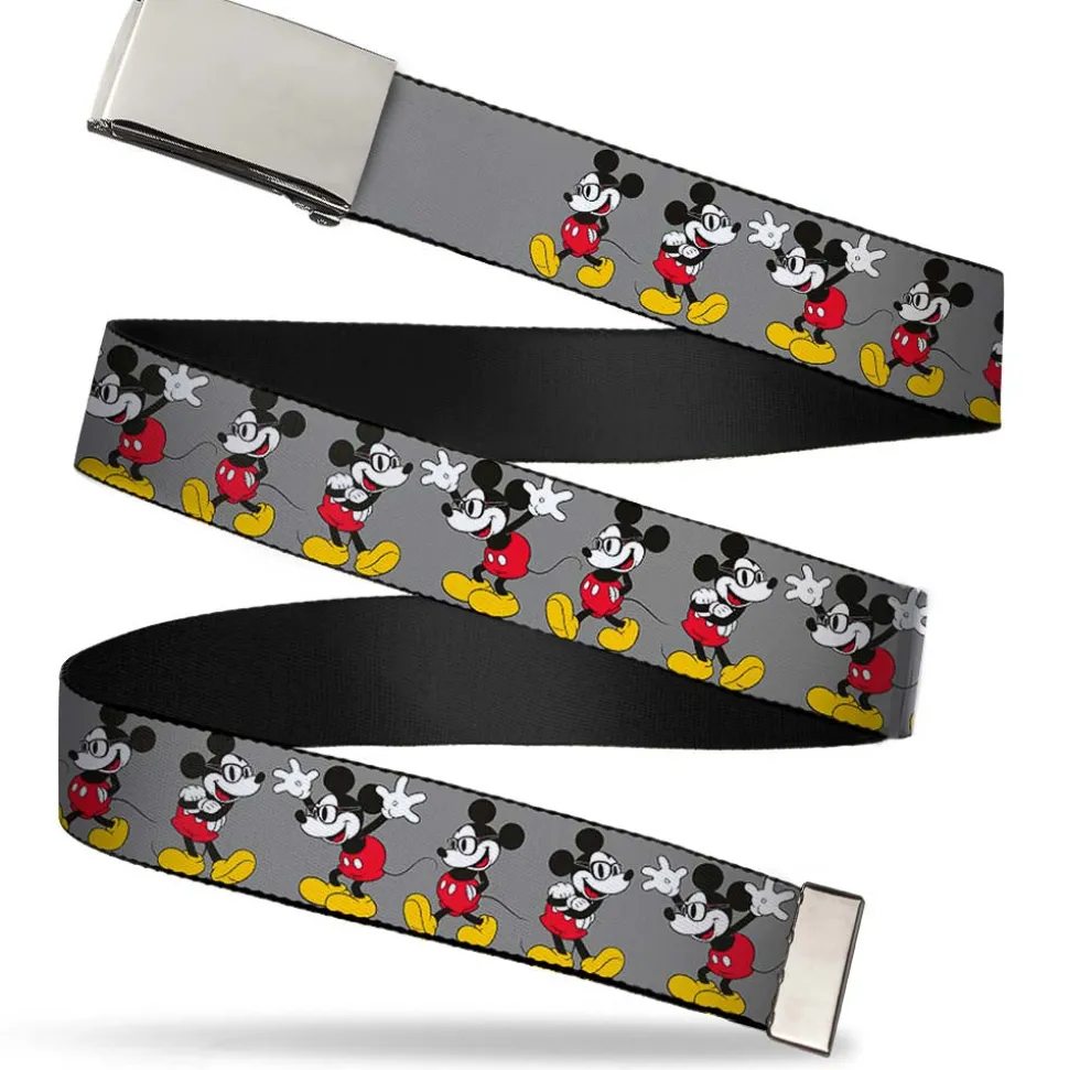 Chrome Buckle Web Belt – Mickey Mouse w/Glasses Poses Gray Webbing