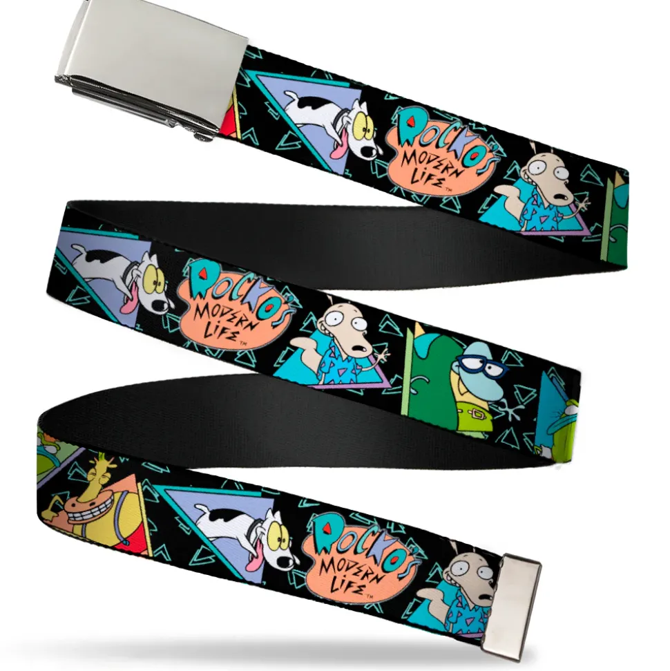 Chrome Buckle Web Belt – ROCKO'S MODERN LIFE Character Portraits/Triangles Black/Blue Webbing