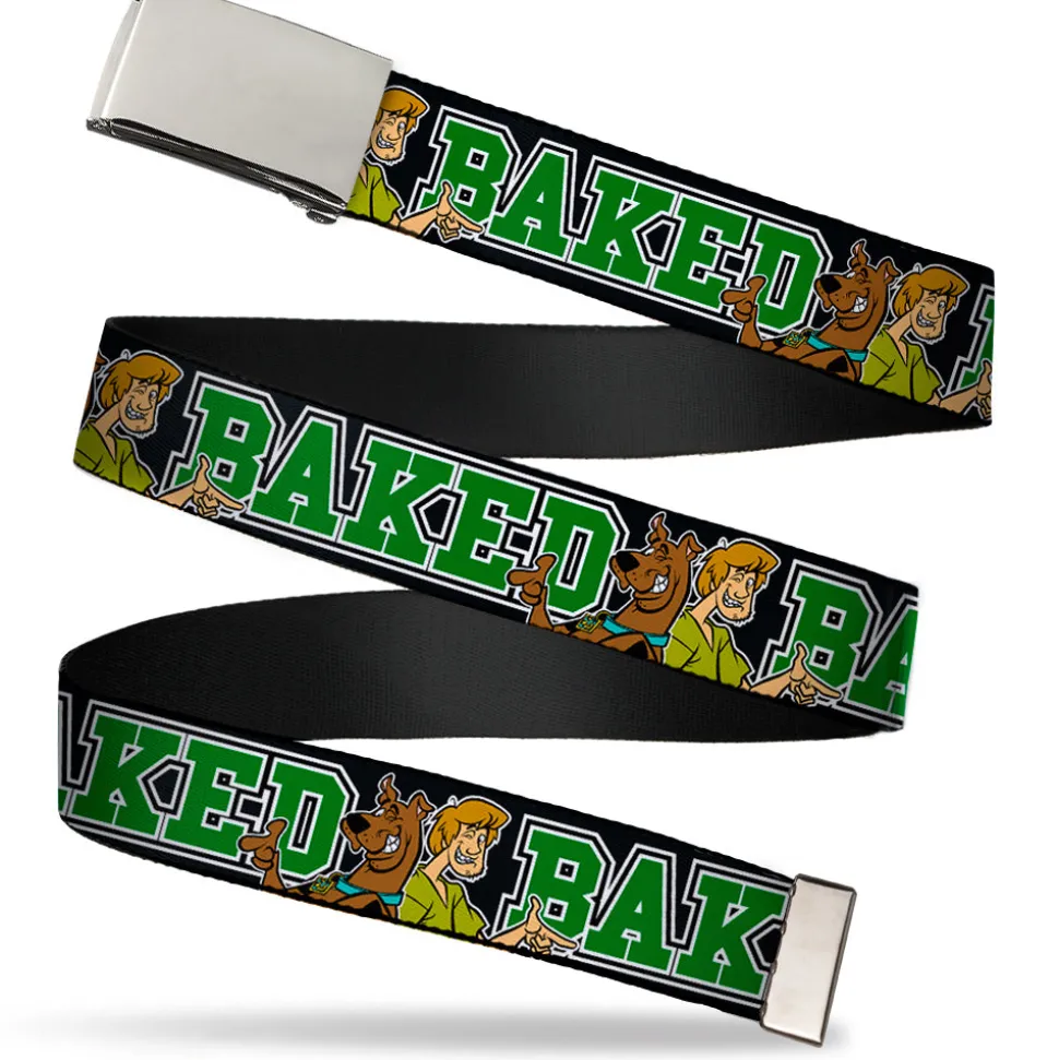 Chrome Buckle Web Belt – Scooby Doo & Shaggy Pose/BAKED Black/Green Webbing