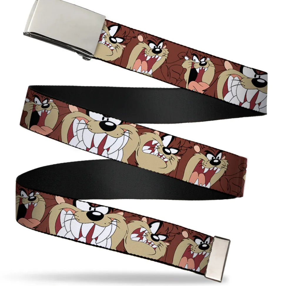 This unique web belt features a solid plain military-style clasp Buckle. It features beautiful artwork which is dyed into the fabric to ensure it looks great for years. This belt is available in 1.0″, 1.25″, and 1.5″ widths. 1.0″ wide belt is sized for children and adults with pants size 30 or lower. 1.25″ and 1.5″ wide belts are sized for adults, fitting up to pant size 42. This web belt is made from high-density nylon and steel. 1.5″ wide belt also has a bottle opener built into the back of the buckle! This product is Made in the USA by Buckle-Down Inc. and is officially licensed by Looney Tunes.