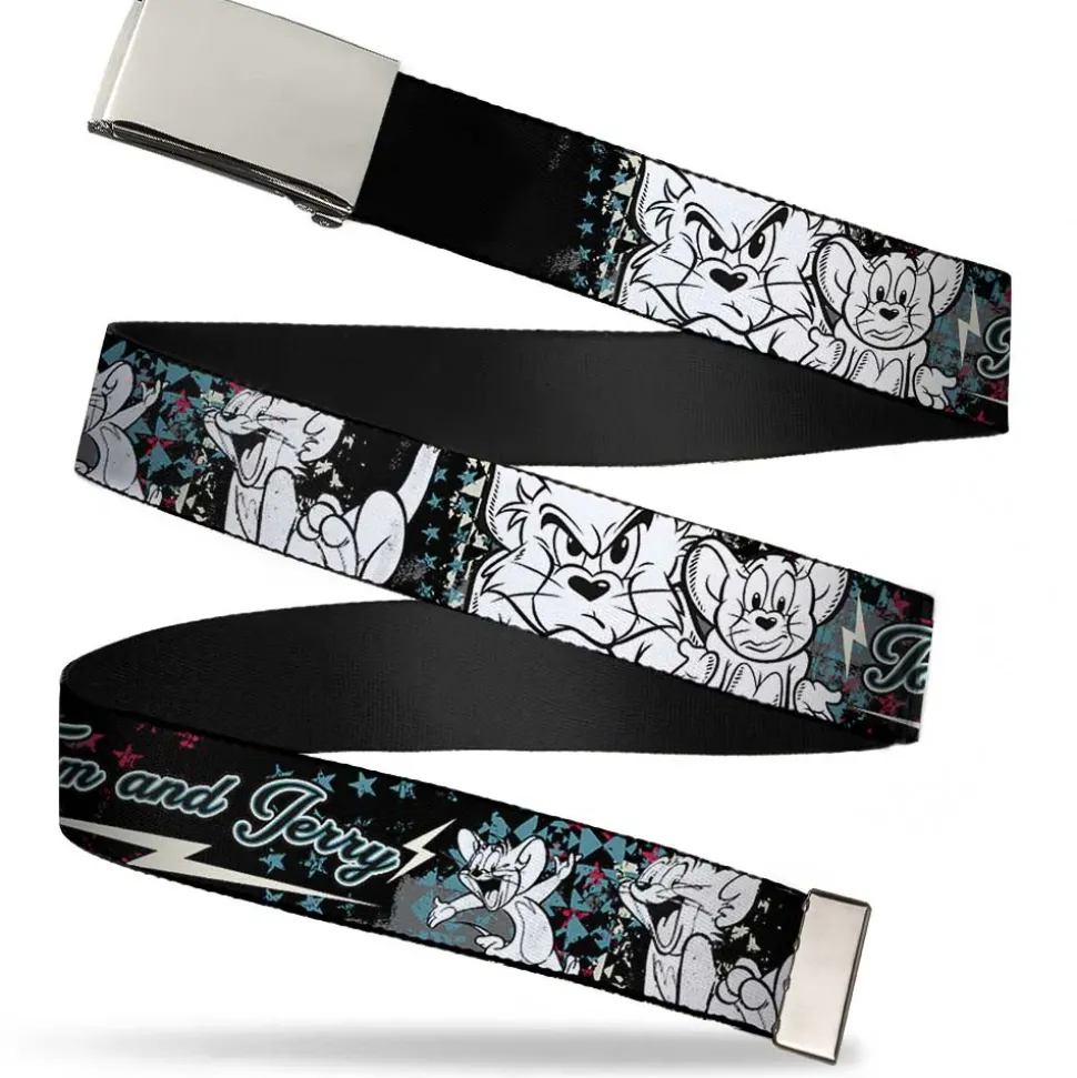 This unique web belt features a solid plain military-style clasp Buckle. It features beautiful artwork which is dyed into the fabric to ensure it looks great for years. This belt is available in 1.0″, 1.25″, and 1.5″ widths. 1.0″ wide belt is sized for children and adults with pants size 30 or lower. 1.25″ and 1.5″ wide belts are sized for adults, fitting up to pant size 42. This web belt is made from high-density nylon and steel. 1.5″ wide belt also has a bottle opener built into the back of the buckle! This product is Made in the USA by Buckle-Down Inc. and is officially licensed by Tom and Jerry.