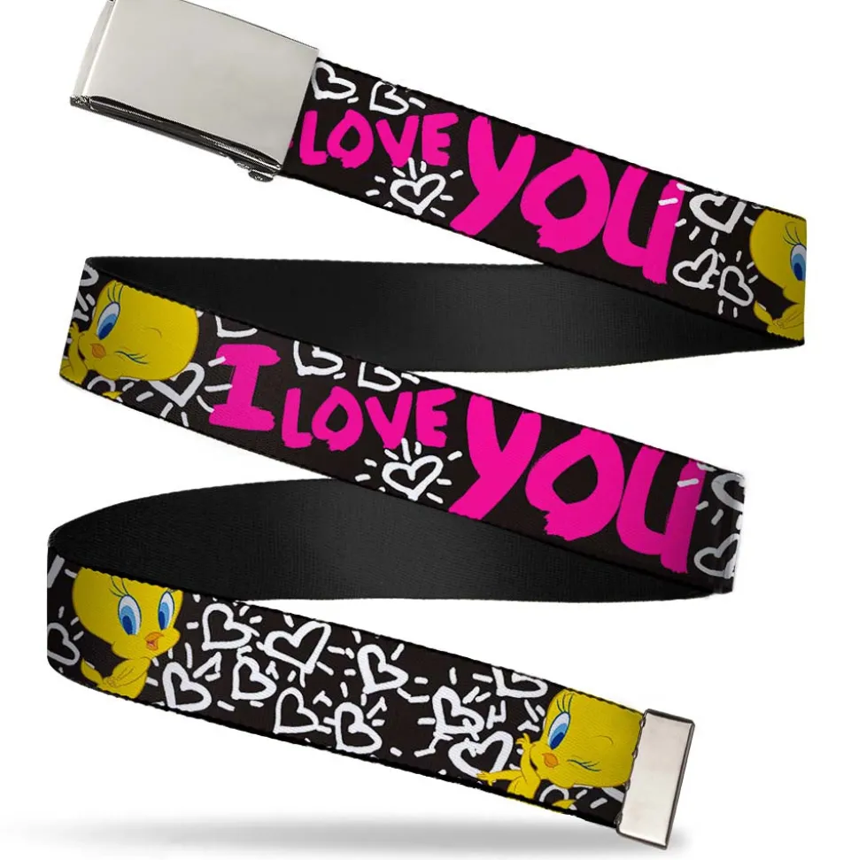 Chrome Buckle Web Belt - Tweety Bird I LOVE YOU Black/White/Pink Webbing