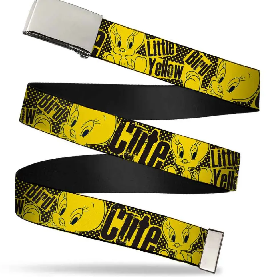 Chrome Buckle Web Belt – Tweety Bird Poses CUTE LITTLE YELLOW BIRD Yellow/Black Webbing