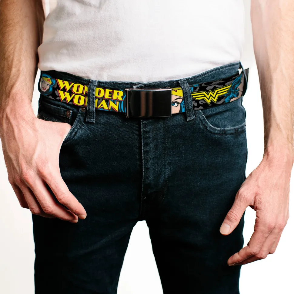 Chrome Buckle Web Belt – WONDER WOMAN w/Face CLOSE-UP Leopard Black/Gray Webbing
