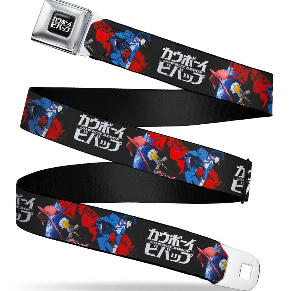 COWBOY BEBOP Title Logo Full Color Black/White Seatbelt Belt – COWBOY BEBOP Spike Pose and Crew Collage and Title Logo Black Webbing
