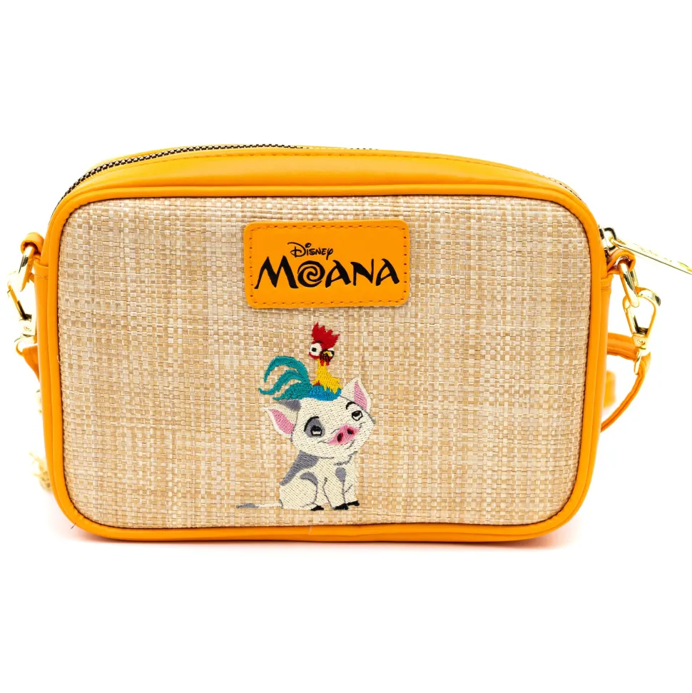 Disney Bag, Horizontal Cross Body, Moana Embroidered Skirt Pattern with Hei Hei and Pua Pose, Raffia Straw