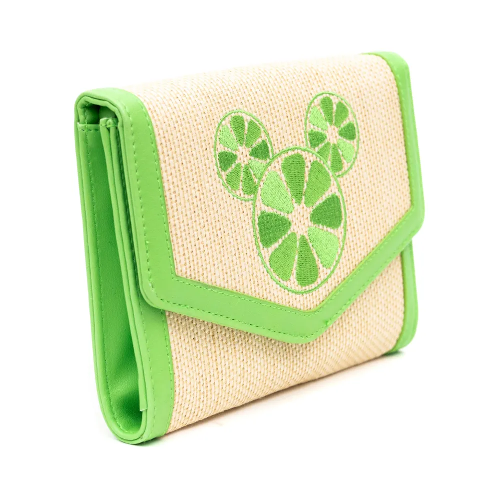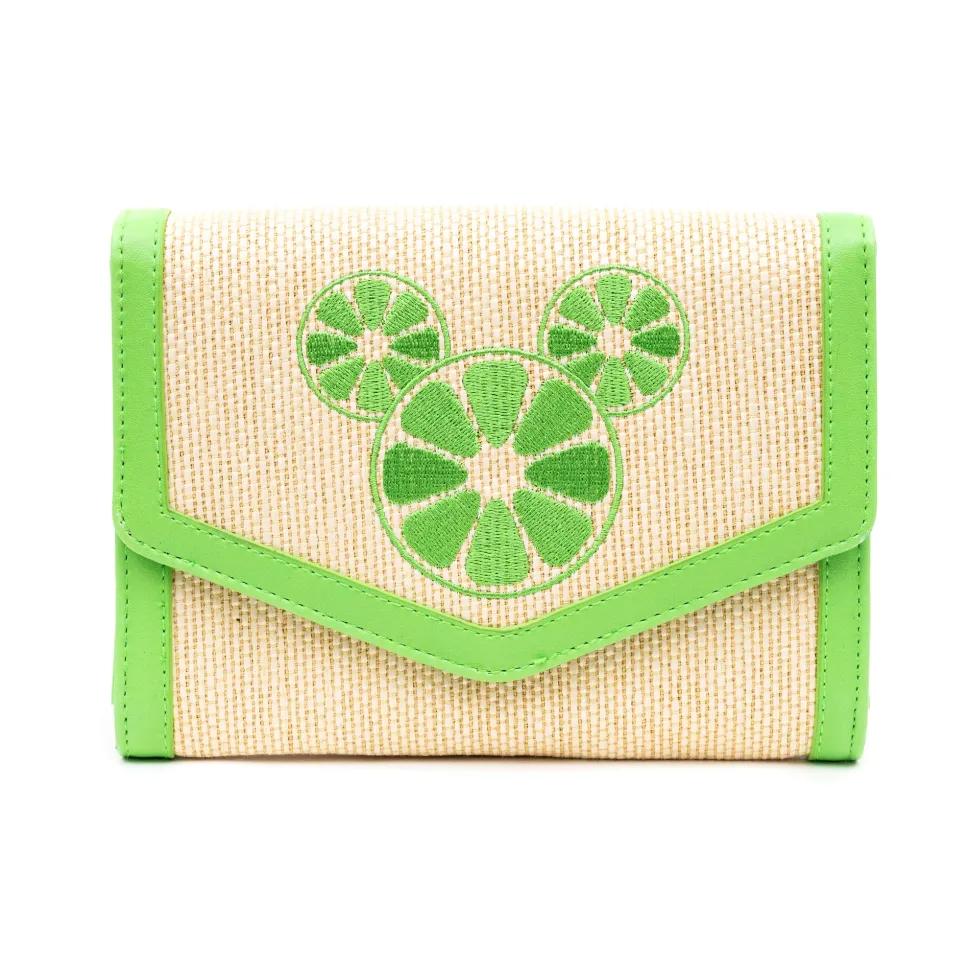 Disney Bag, Horizontal Fold Over Cross Body, Mickey Mouse Embroidered Citrus Ears Lime Green, Raffia Straw