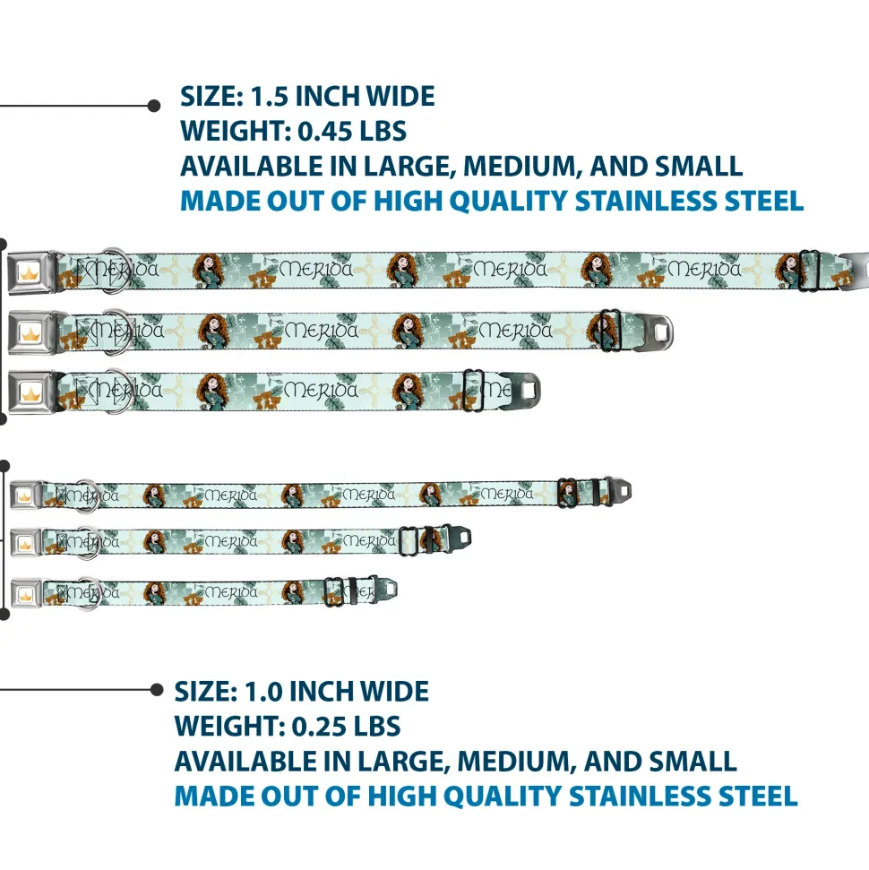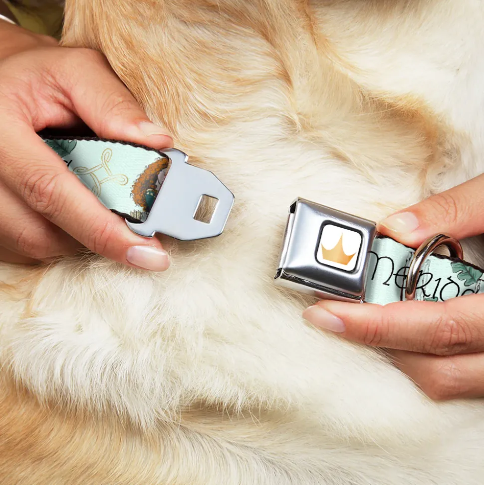 Disney Princess Crown Full Color Golds Seatbelt Buckle Collar – Brave Merida Castle and Three Bear Brothers Pose with Script Greens