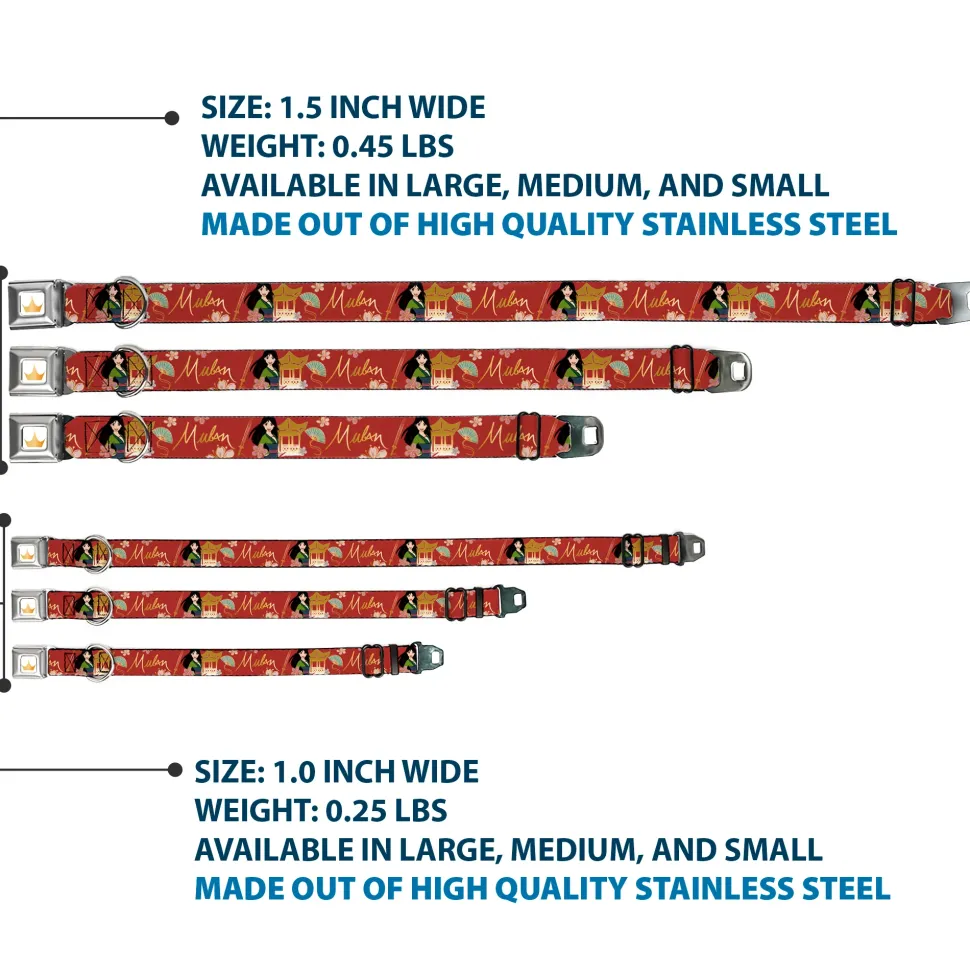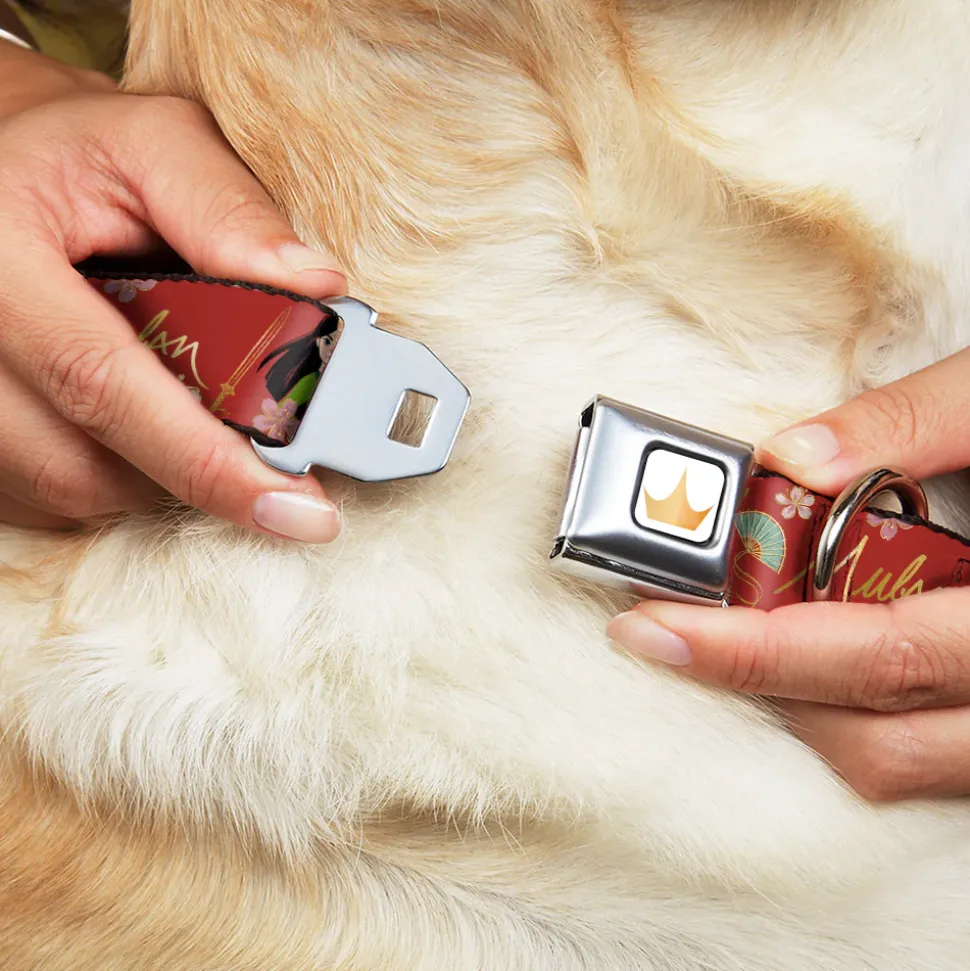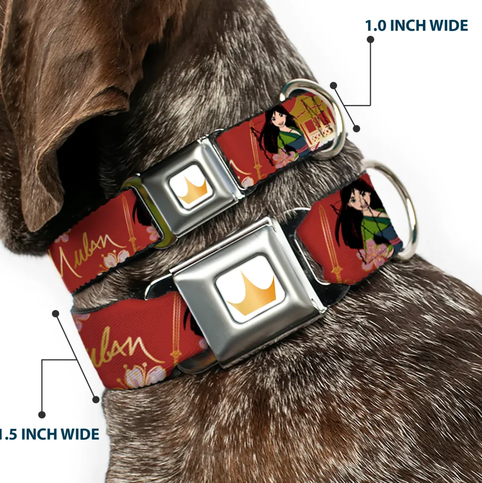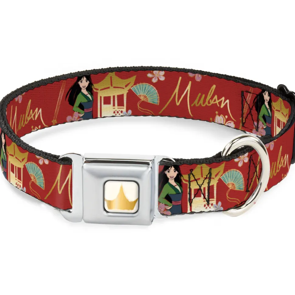 Disney Princess Crown Full Color Golds Seatbelt Buckle Collar – Mulan Gazebo Pose with Flowers and Script Red/Golds