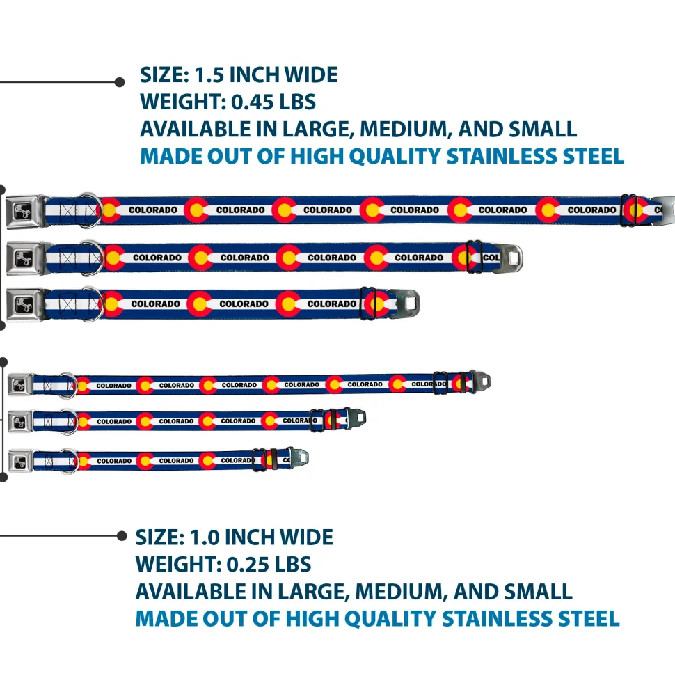 Dog Bone Black/Silver Seatbelt Buckle Collar – COLORADO Text Flag Blue/White/Red/Yellow