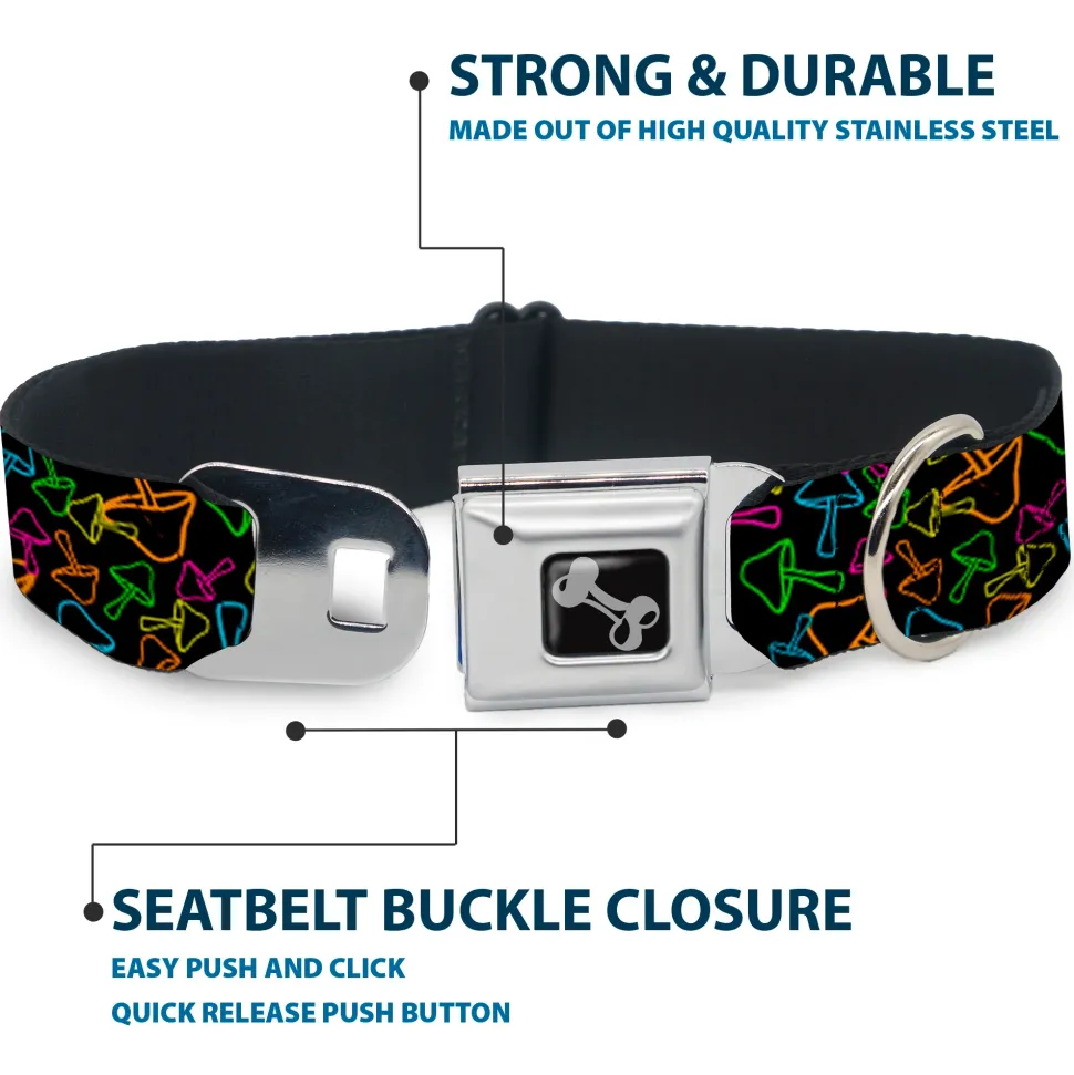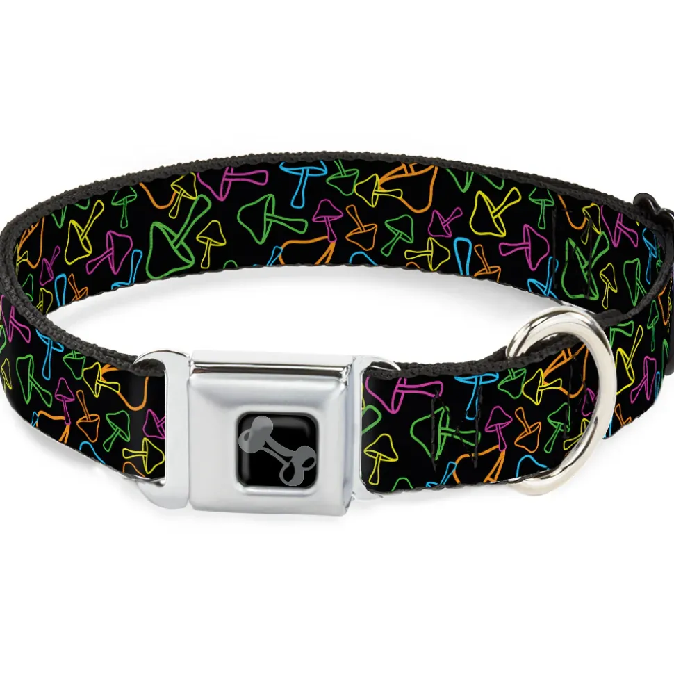 Dog Bone Black/Silver Seatbelt Buckle Collar – Mushroom Outline Scattered Black/Multi Neon
