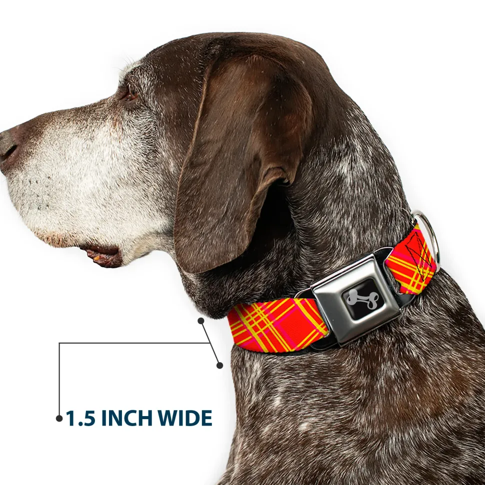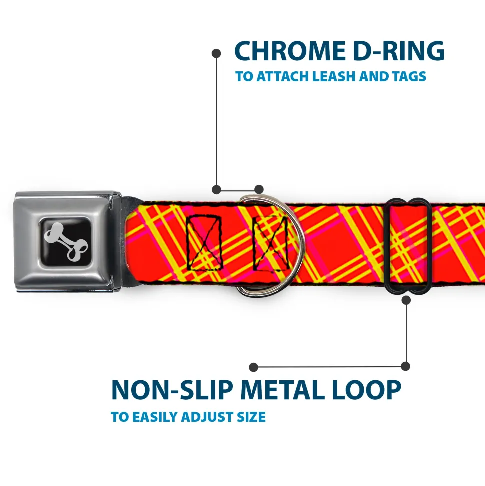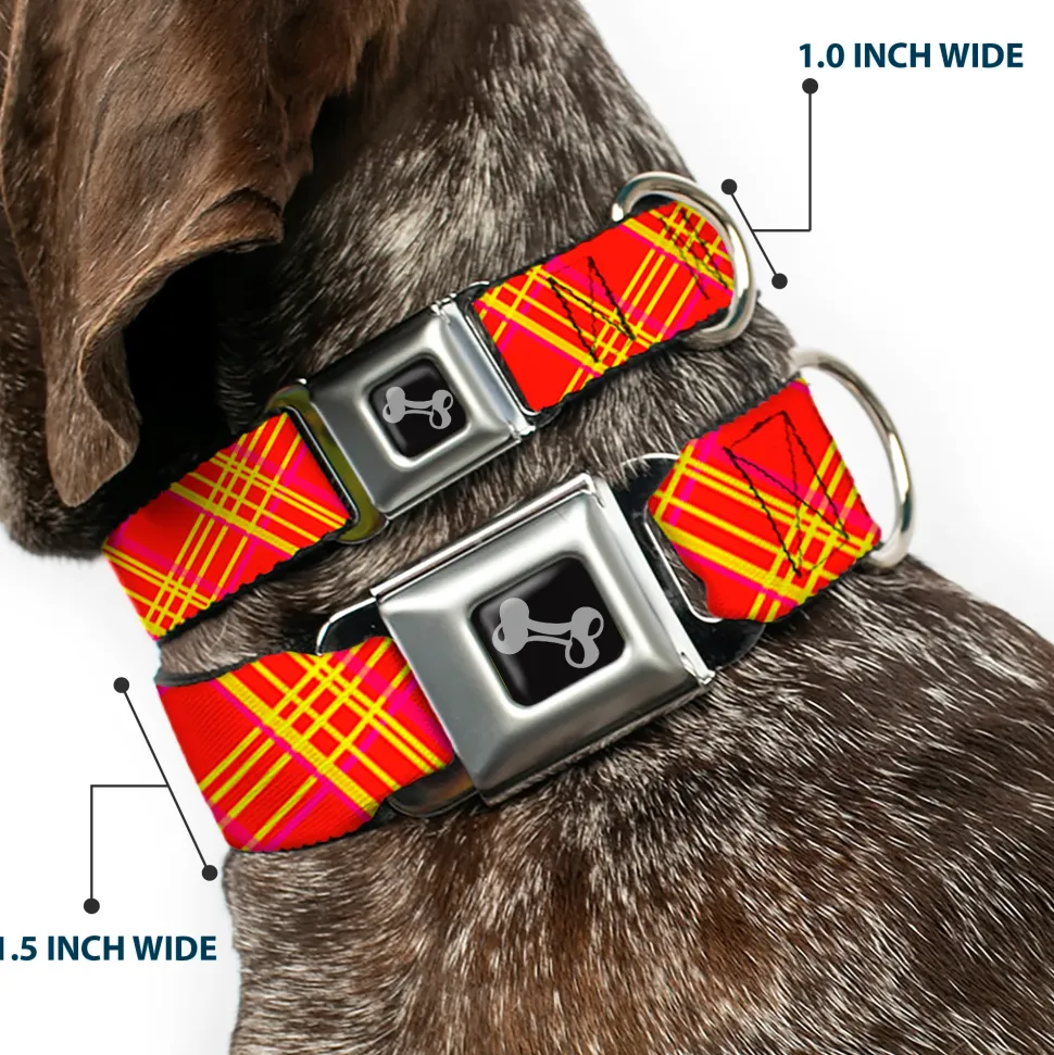 Dog Bone Black/Silver Seatbelt Buckle Collar – Plaid X4 Fluorescent Oranges/Pinks/Yellow