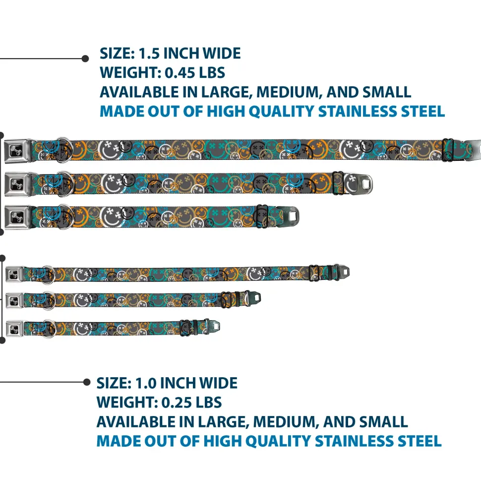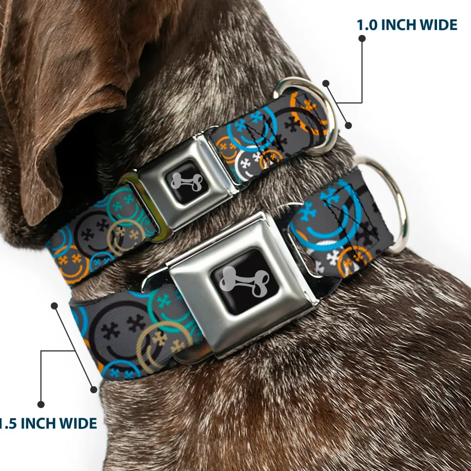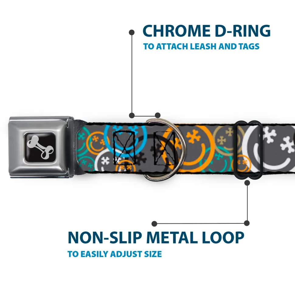 Dog Bone Black/Silver Seatbelt Buckle Collar – Smiley Face Crossbones Stacked Gray/Multi Color