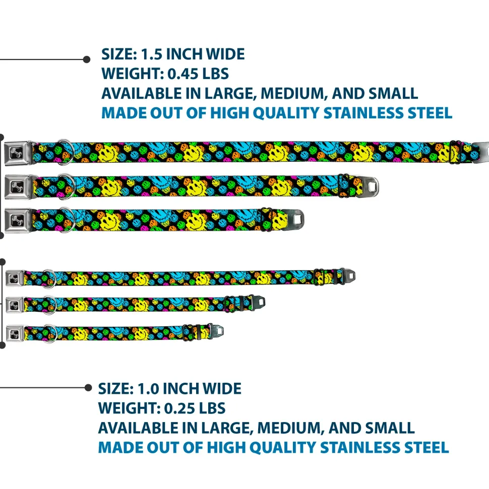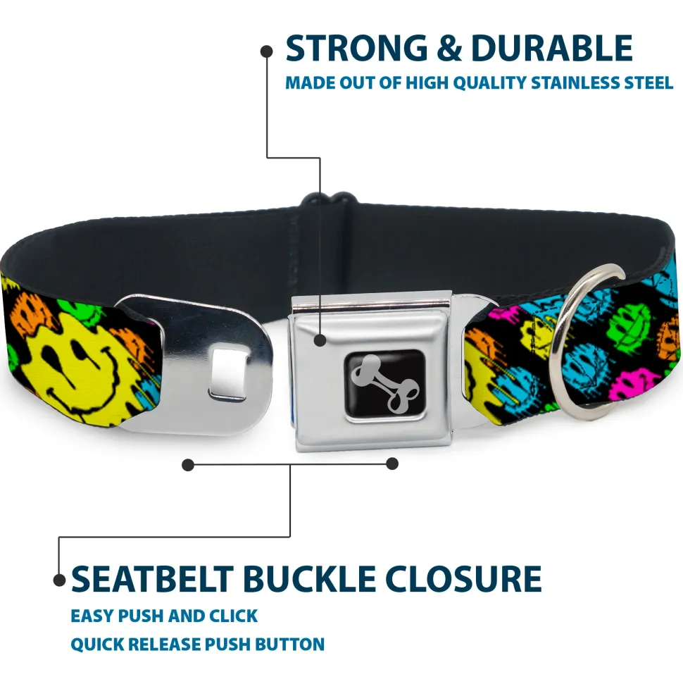 Dog Bone Black/Silver Seatbelt Buckle Collar – Smiley Faces Melted Stacked Black/Multi Neon