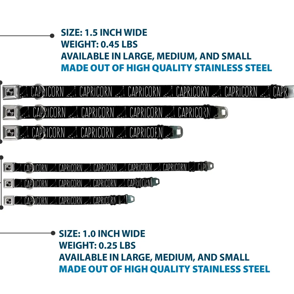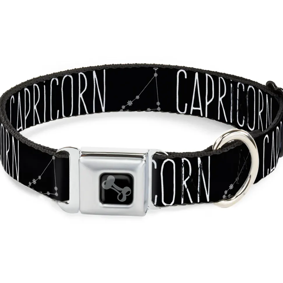 Dog Bone Black/Silver Seatbelt Buckle Collar – Zodiac CAPRICORN/Constellation Black/White