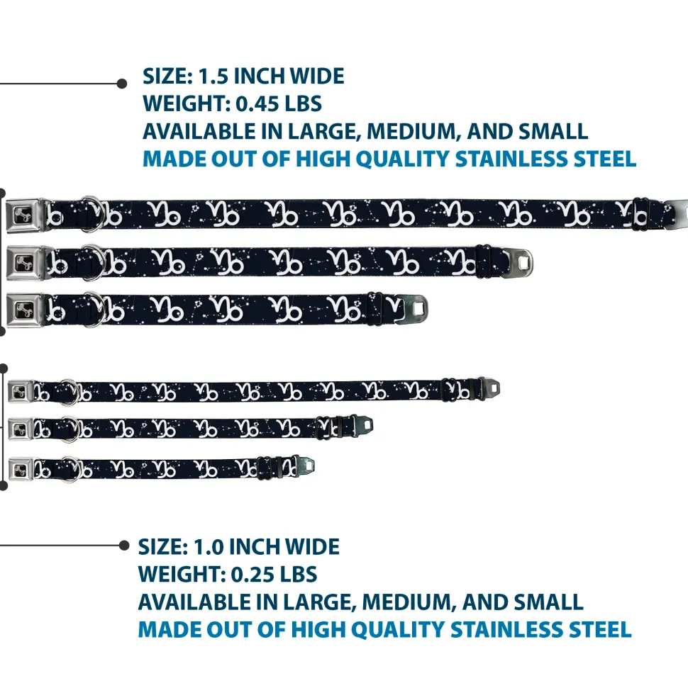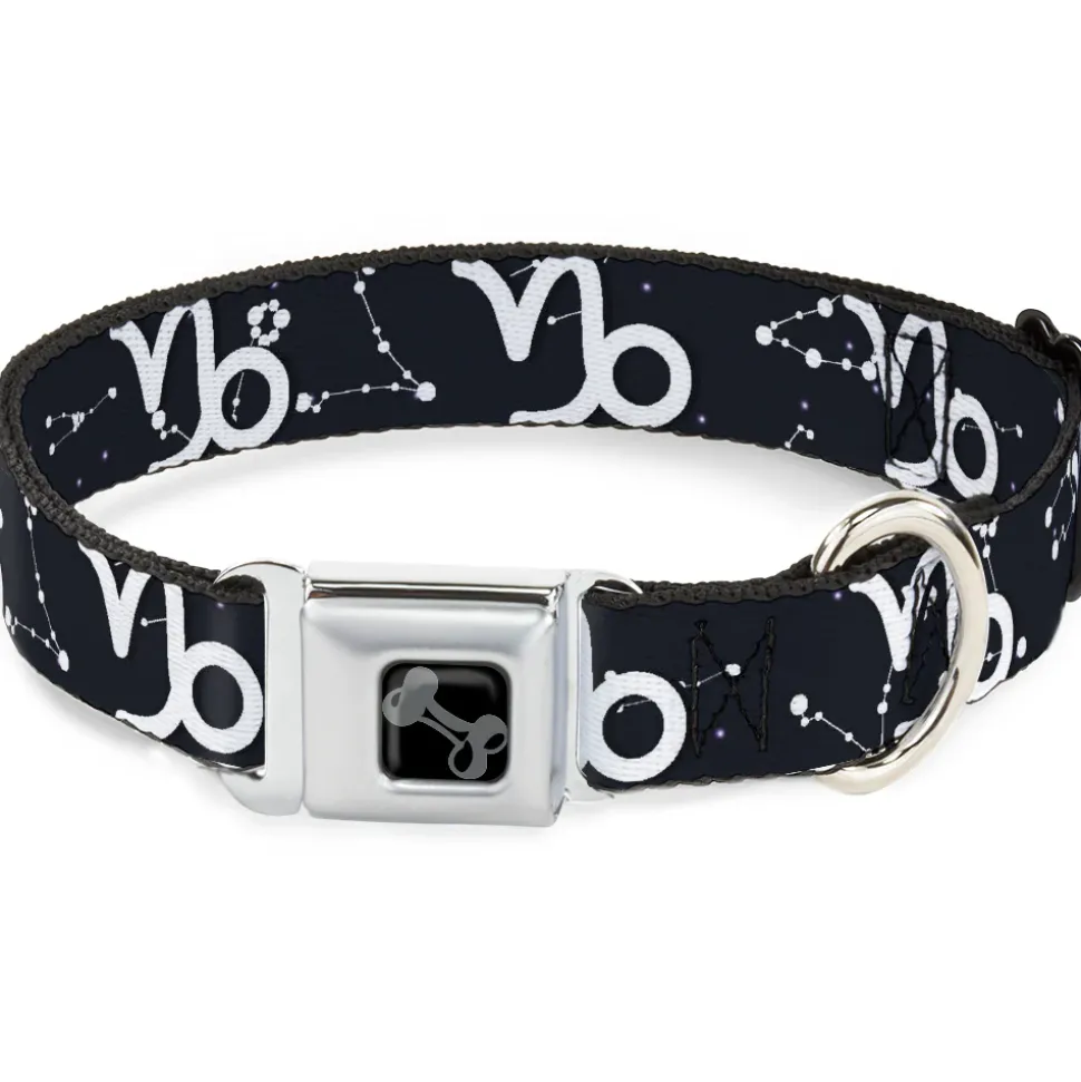 Dog Bone Black/Silver Seatbelt Buckle Collar – Zodiac Capricorn Symbol/Constellations Black/White