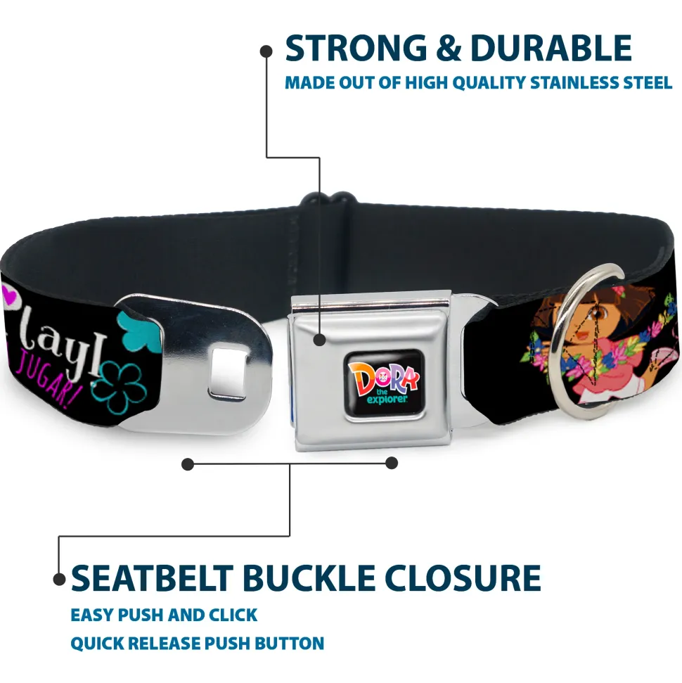 DORA THE EXPORER Logo2 Black/Multi Color Seatbelt Buckle Collar – Dora & Boots Pose/Floral LET'S PLAY!/VAMOS A JUGAR! Black/White/Multi Color