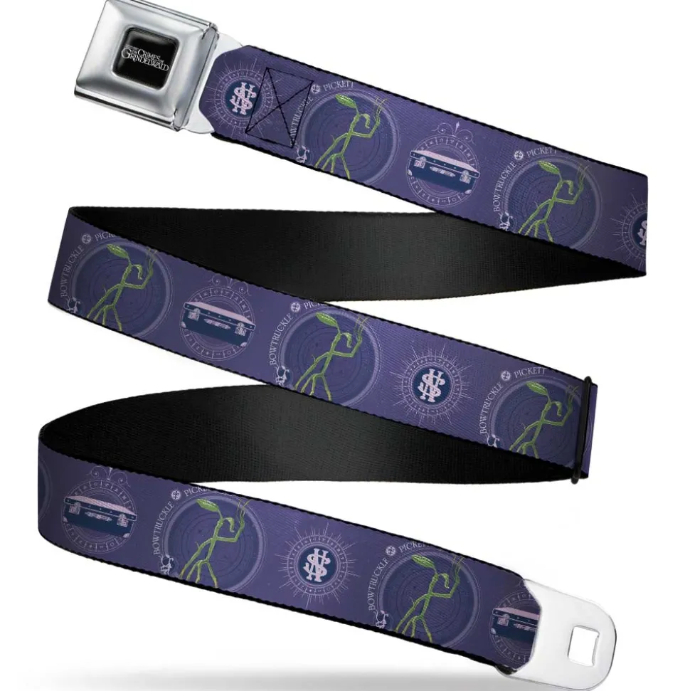 FANTASTIC BEASTS THE CRIMES OF GRINDELWALD Logo Full Color Black/Silvers Seatbelt Belt – BOWTRUCKLE PICKETT Pose/Icons Purples/Blues/White Webbing