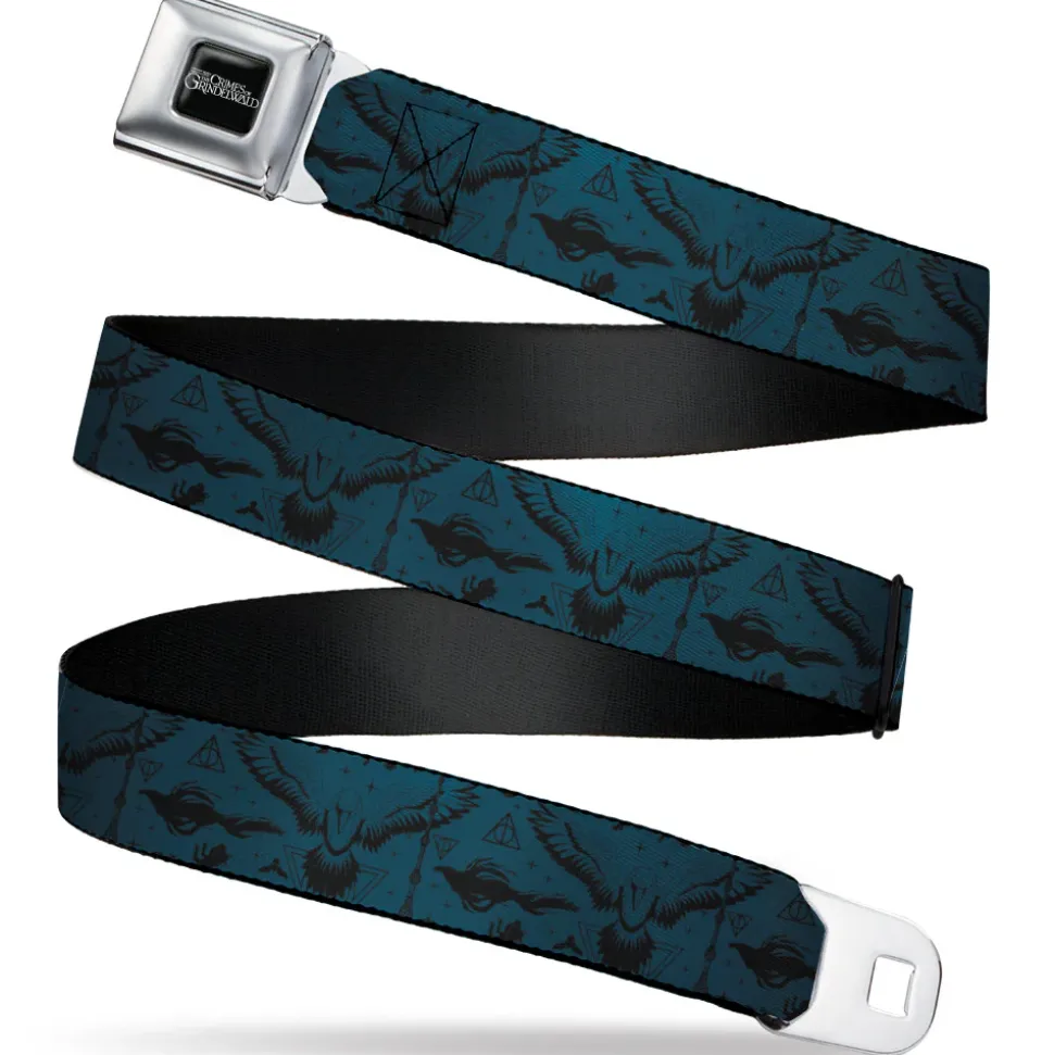 FANTASTIC BEASTS THE CRIMES OF GRINDEWALD Logo Full Color Black/White Seatbelt Belt – Fantastic Beasts The Crimes of Grindelwald Icons/Beasts Collage Blue/Black Webbing