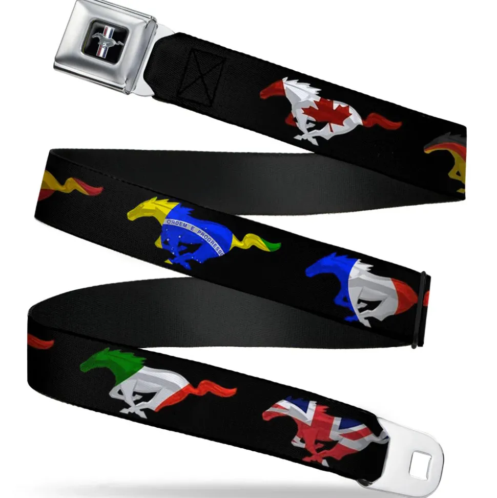 Ford Mustang Emblem Seatbelt Belt – Mustang Silhouette Black/International Flags Webbing
