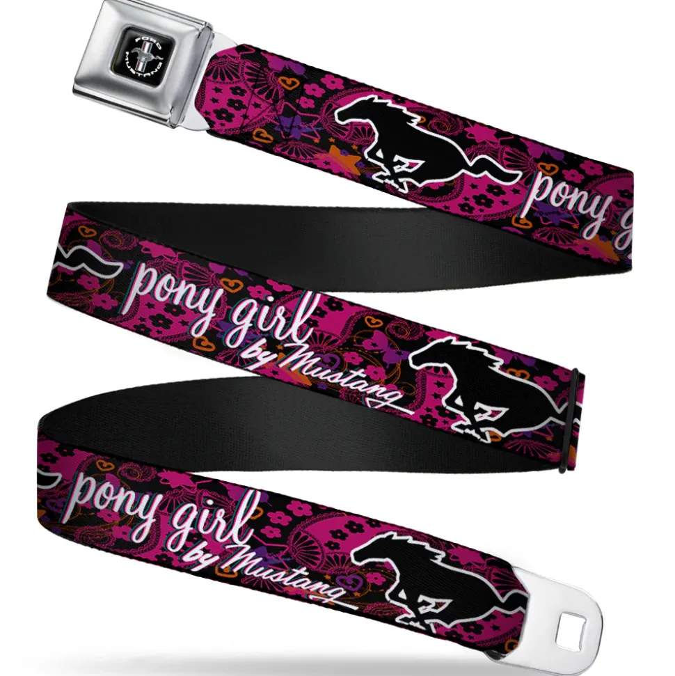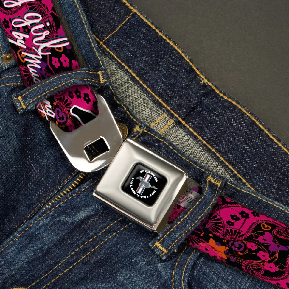 FORD MUSTANG Tri-Bar Logo Full Color Black White Silver Red Blue Seatbelt Belt – Mustang PONY GIRL/Floral Collage Black/Pinks/White Webbing
