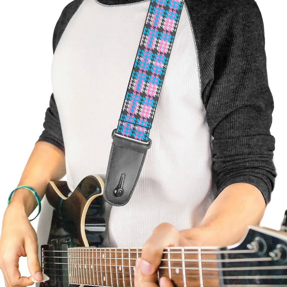 Guitar Strap - Mini Houndstooth Gray Baby Blue Pink