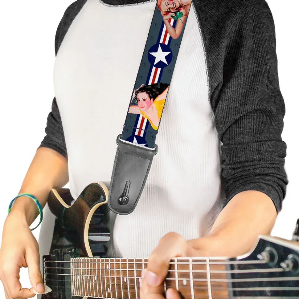 Guitar Strap - Pin Up Girl Poses Stars & Stripes Gray Blue White Red