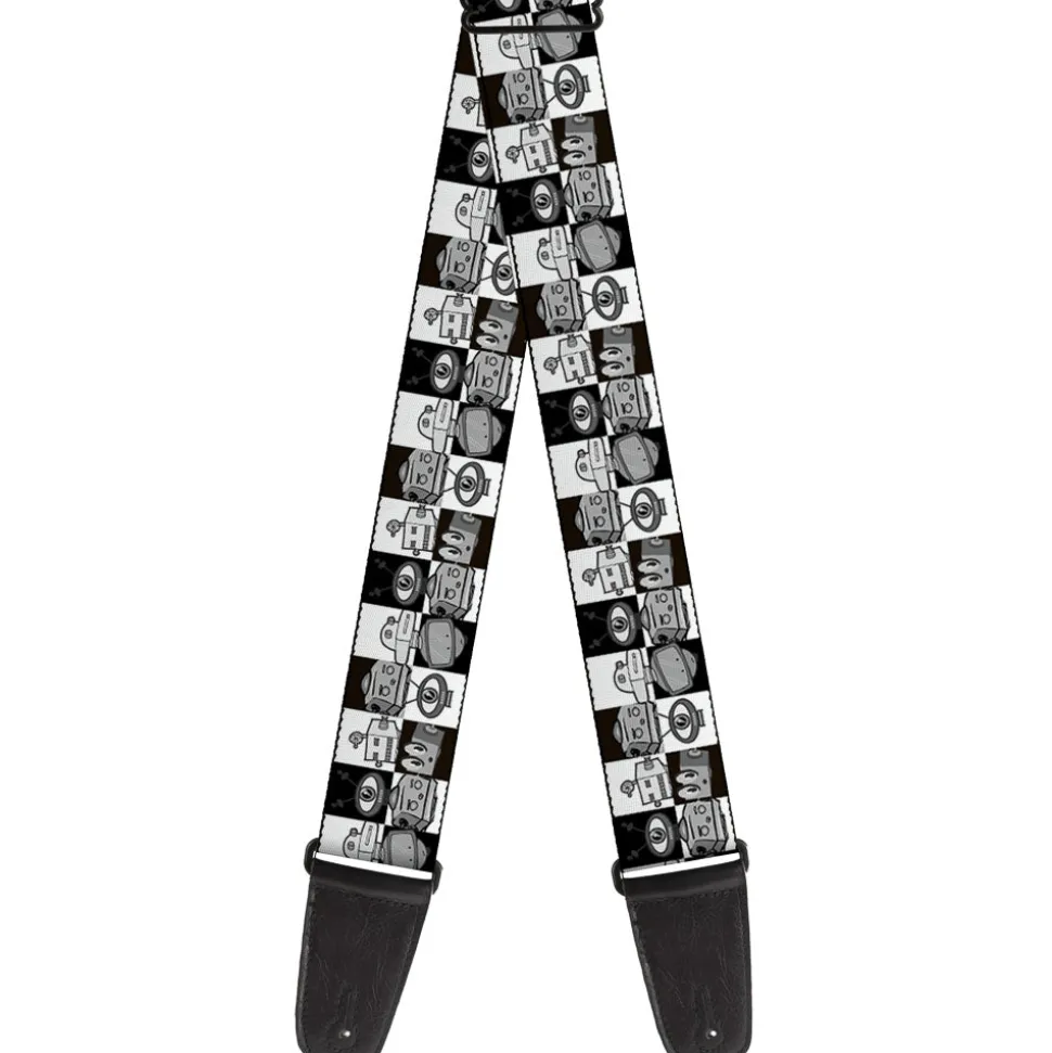 Guitar Strap - Robot Heads Checkers Black White