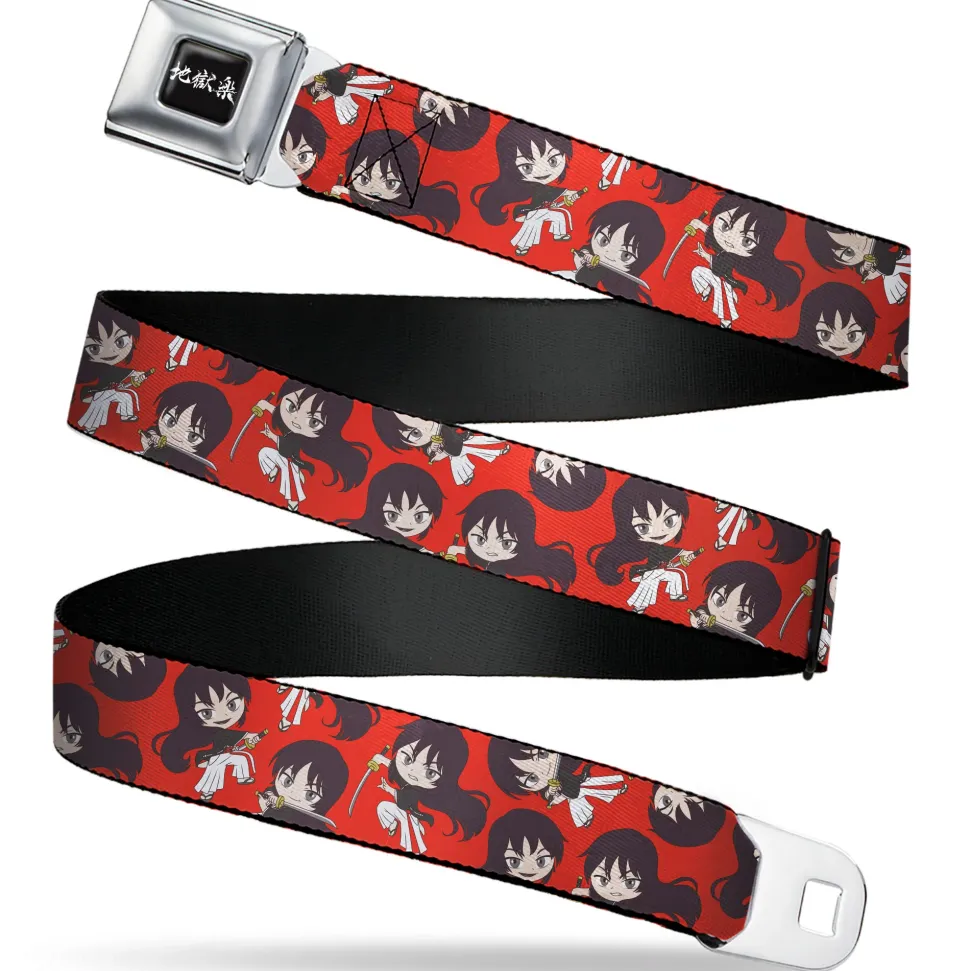 Hell's Paradise Kanji Title Logo Full Color Black/White Seatbelt Belt – Hell's Paradise Chibi Aza Toma Sword Poses Scattered Red Webbing