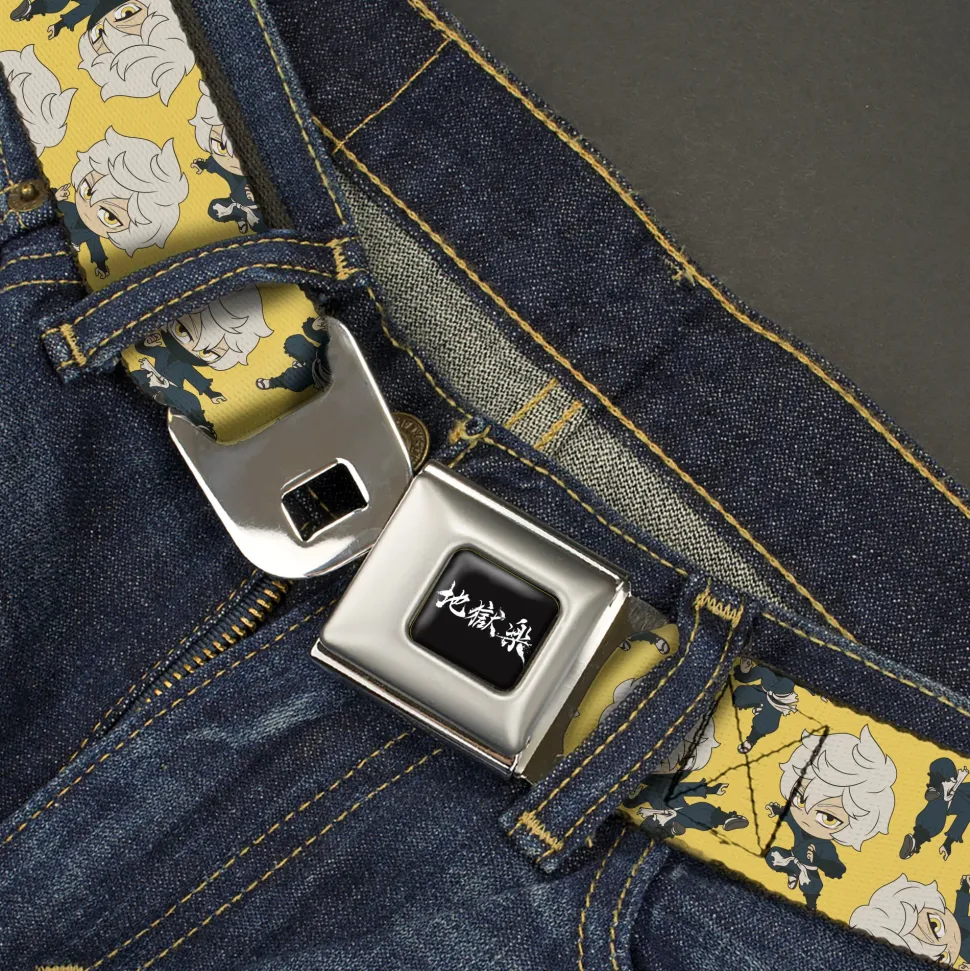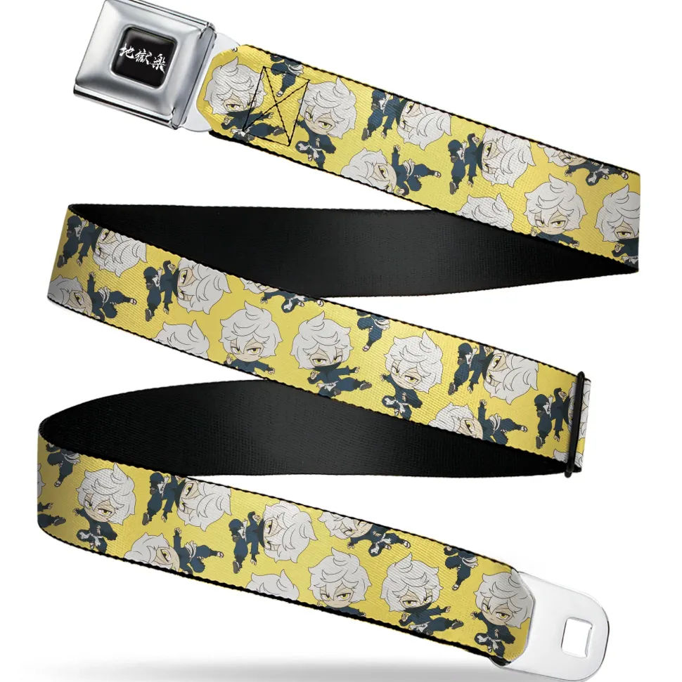 Hell's Paradise Kanji Title Logo Full Color Black/White Seatbelt Belt – Hell's Paradise Chibi Gabimaru Poses Scattered Yellow Webbing