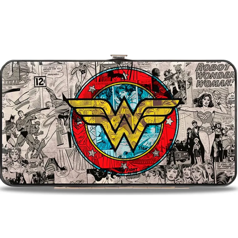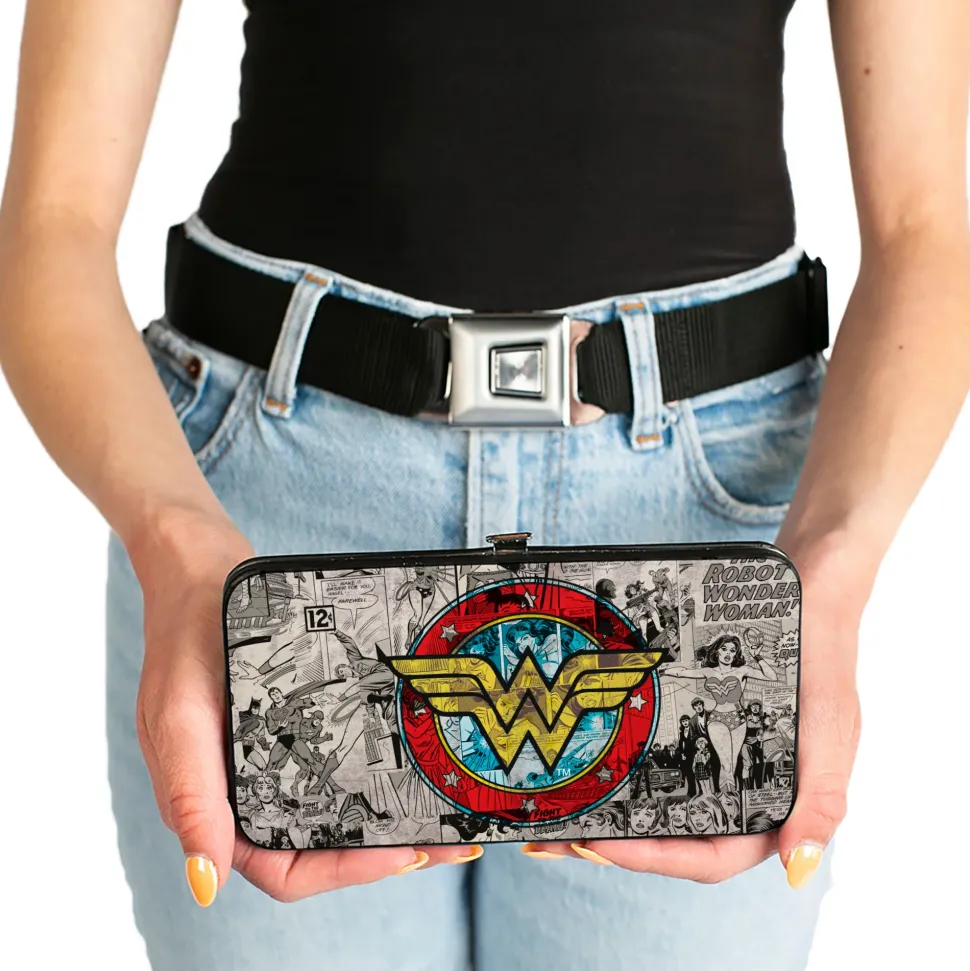 Hinged Wallet - Wonder Woman Logo Comic Scenes Grays Blue Red Yellow
