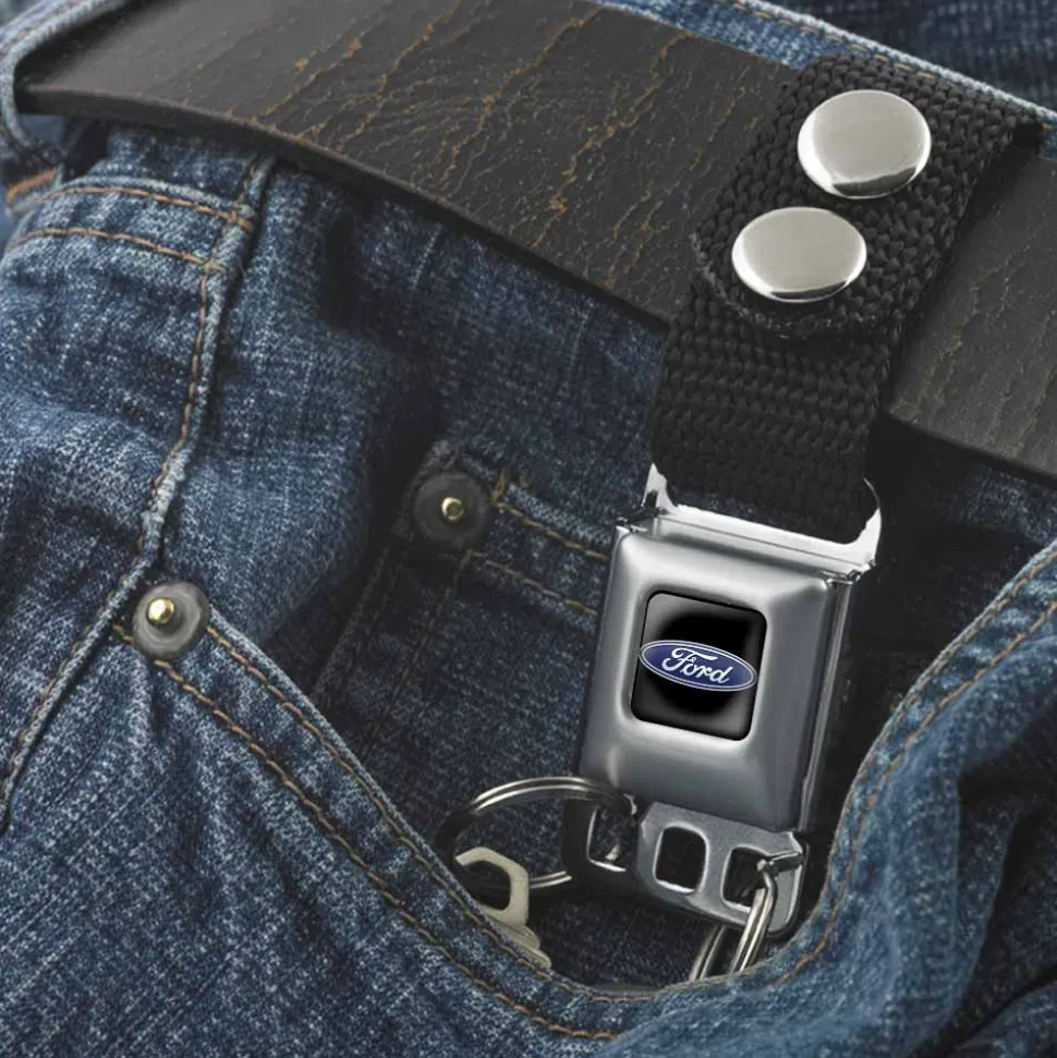 This nifty keychain comes equipped with an authentic SeatBelt Buckle clasp. You can anchor it to a belt loop or bag with two stainless steel snaps and conveniently detach your keys by pressing the center button. The keychain measures 3.0×1.0x0.5 Inches, and is made from nylon and stainless steel. This product is Made in USA by Buckle-Down Inc. and Officially Licensed by Ford.