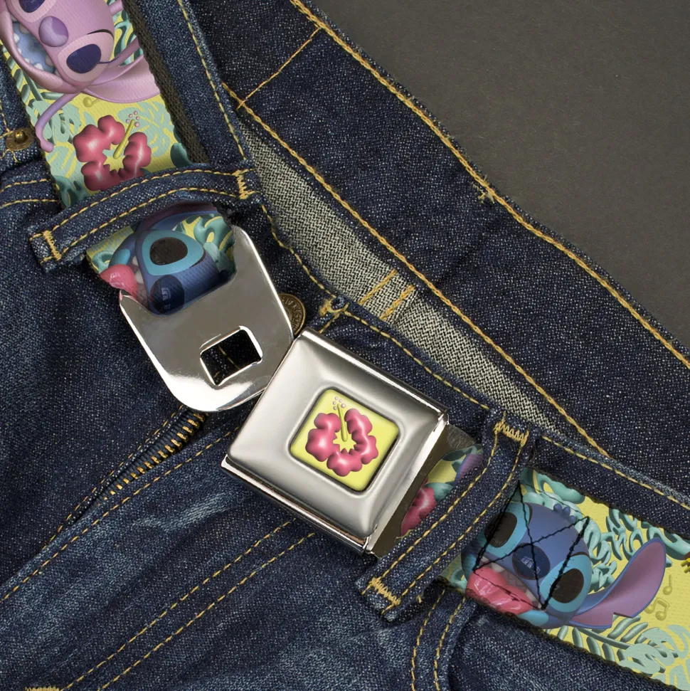 Lilo & Stitch Hibiscus Flower Full Color Yellow/Pink Seatbelt Belt – Angel and Stitch Face and Tropical Icons Yellow/Greens Webbing