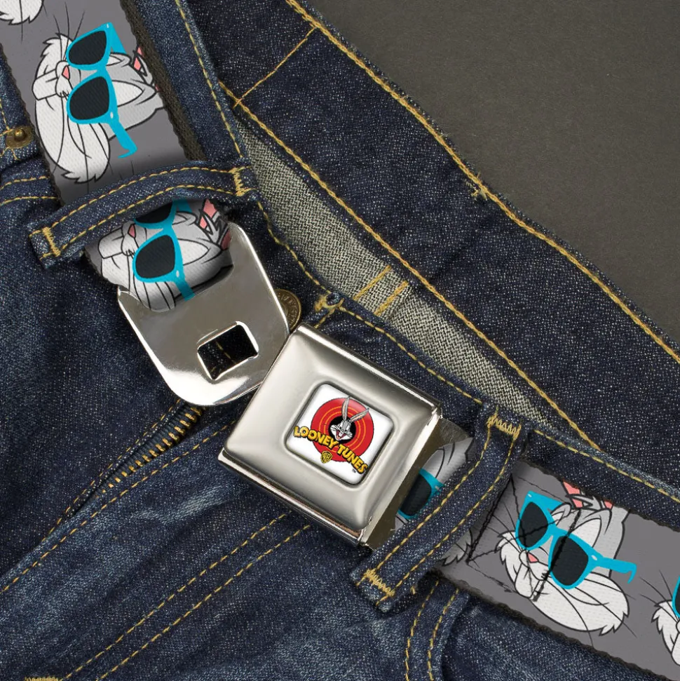 Looney Tunes Logo Full Color White Seatbelt Belt – Bugs Bunny Sunglasses Expression Gray Webbing
