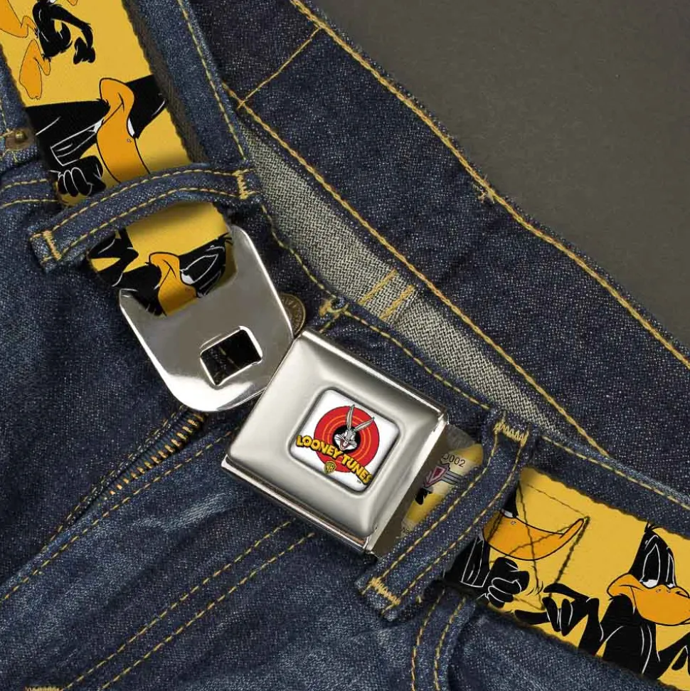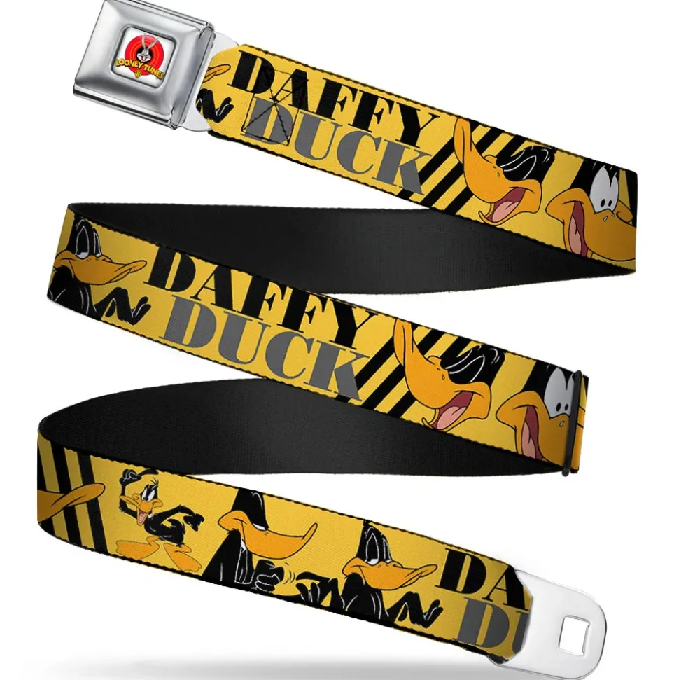 Looney Tunes Logo Full Color White Seatbelt Belt – DAFFY DUCK w/Poses Yellow/Black Webbing