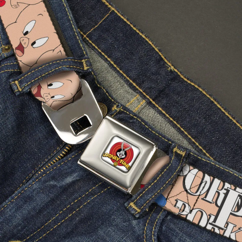 Looney Tunes Logo Full Color White Seatbelt Belt – PORKY PIG w/Poses Pink Webbing