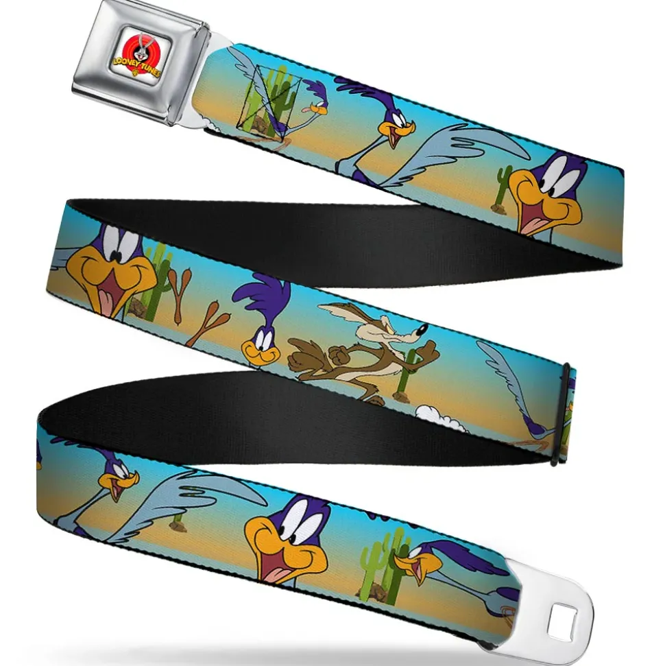 Looney Tunes Logo Full Color White Seatbelt Belt – Road Runner/Wile E. Coyote Scene1 Desert Webbing