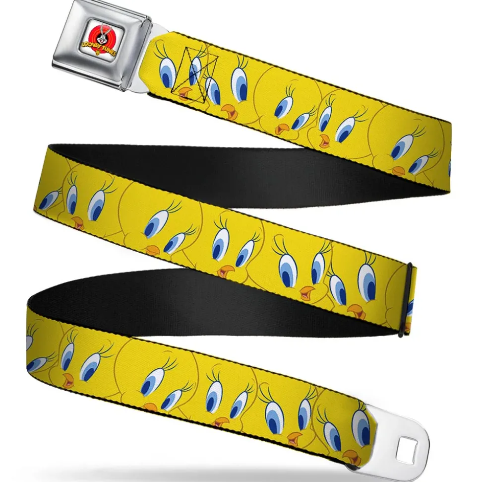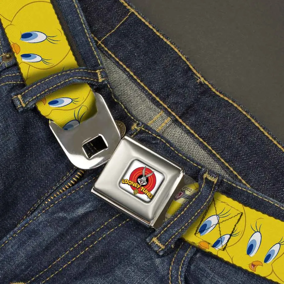 Looney Tunes Logo Full Color White Seatbelt Belt – Tweety Bird Expressions Yellow Webbing