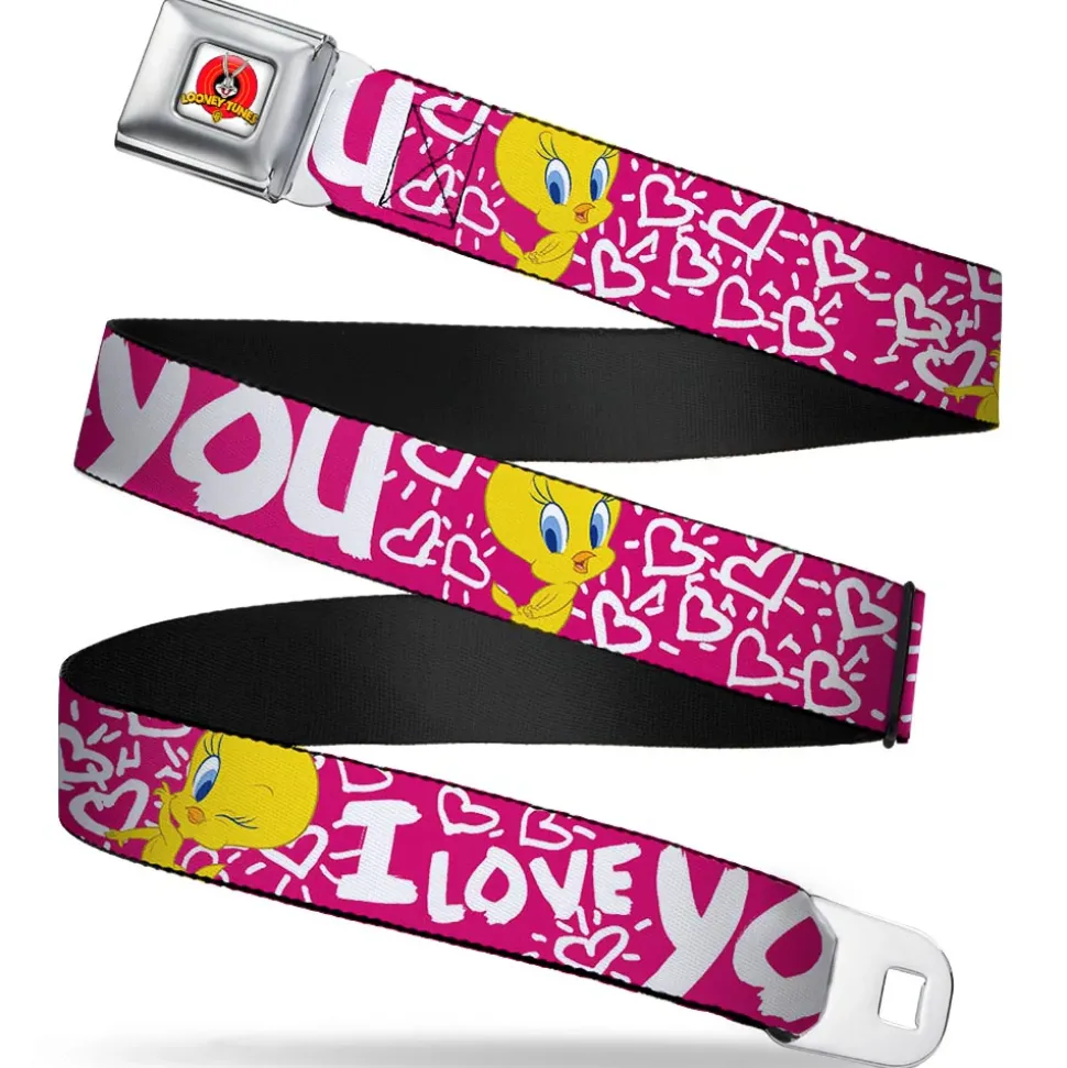 Looney Tunes Logo Full Color White Seatbelt Belt – Tweety Bird I LOVE YOU Fuchsia/White Webbing