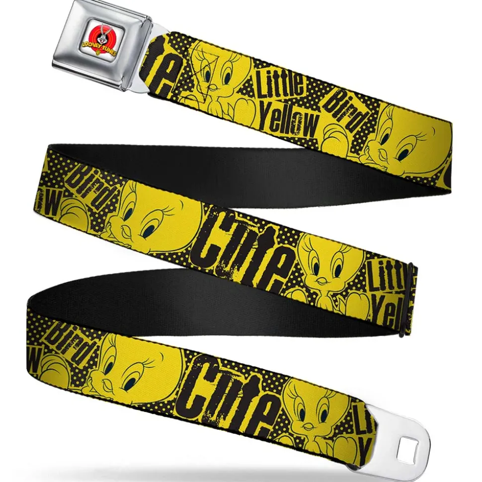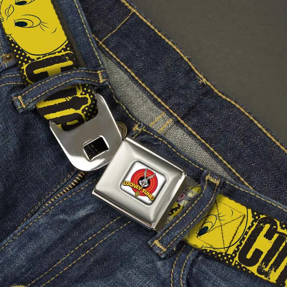 Looney Tunes Logo Full Color White Seatbelt Belt – Tweety Bird Poses CUTE LITTLE YELLOW BIRD Yellow/Black Webbing