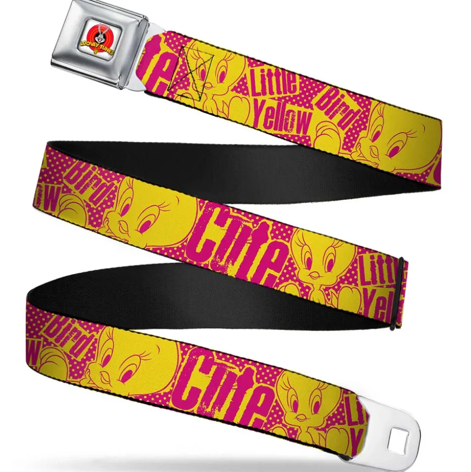 Looney Tunes Logo Full Color White Seatbelt Belt – Tweety Bird Poses CUTE LITTLE YELLOW BIRD Yellow/Pink Webbing