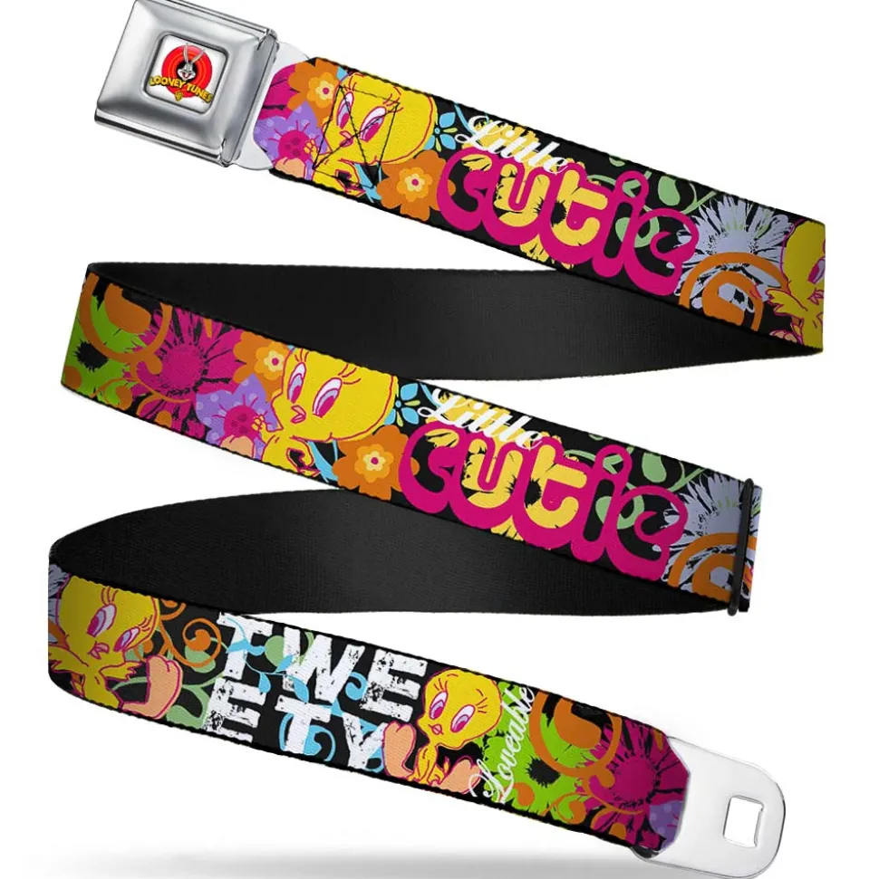 Looney Tunes Logo Full Color White Seatbelt Belt – Tweety Bird Poses LITTLE CUTIE-LOVEABLE Black/Multi Color Webbing