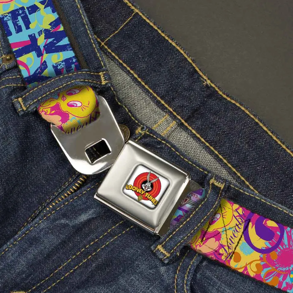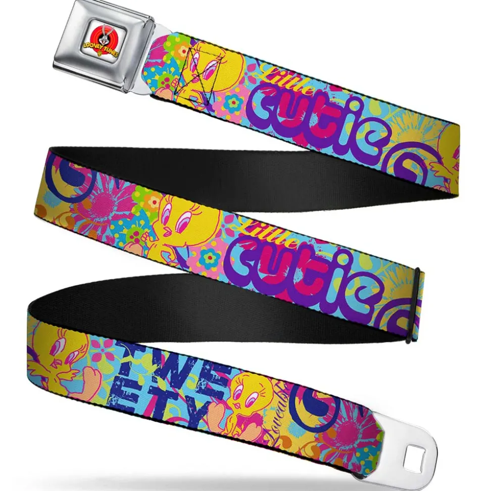 Looney Tunes Logo Full Color White Seatbelt Belt – Tweety Bird Poses LITTLE CUTIE-LOVEABLE Blue/Multi Color Webbing