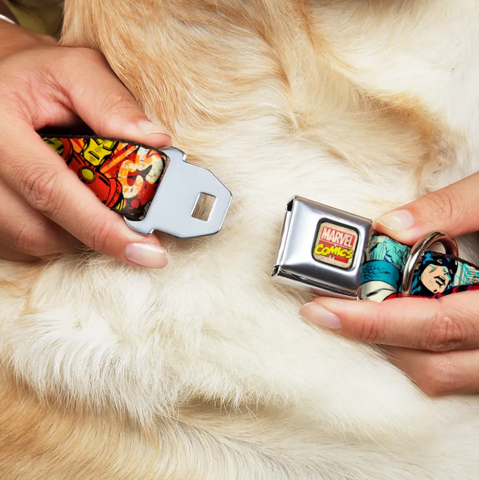 Marvel Comics Logo Full Color Seatbelt Buckle Collar – 4-Superhero Action Poses/Comic Scenes White/Black/Full Color Splatter