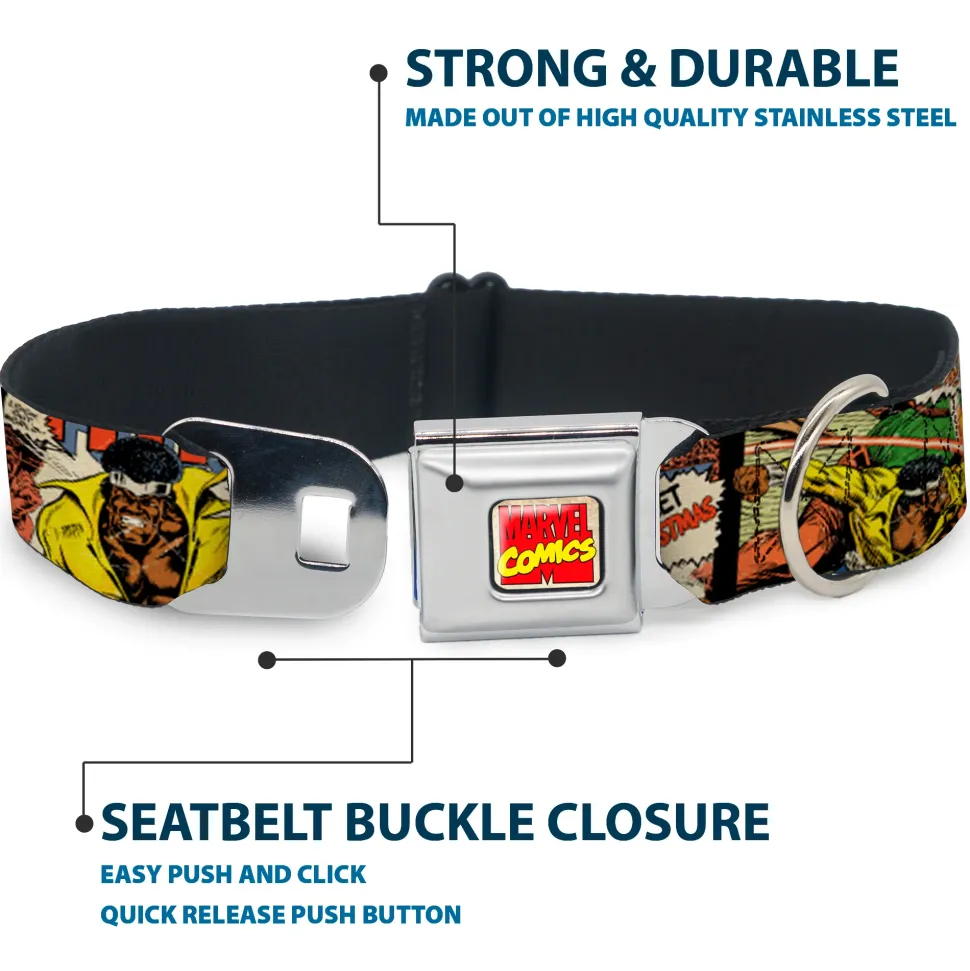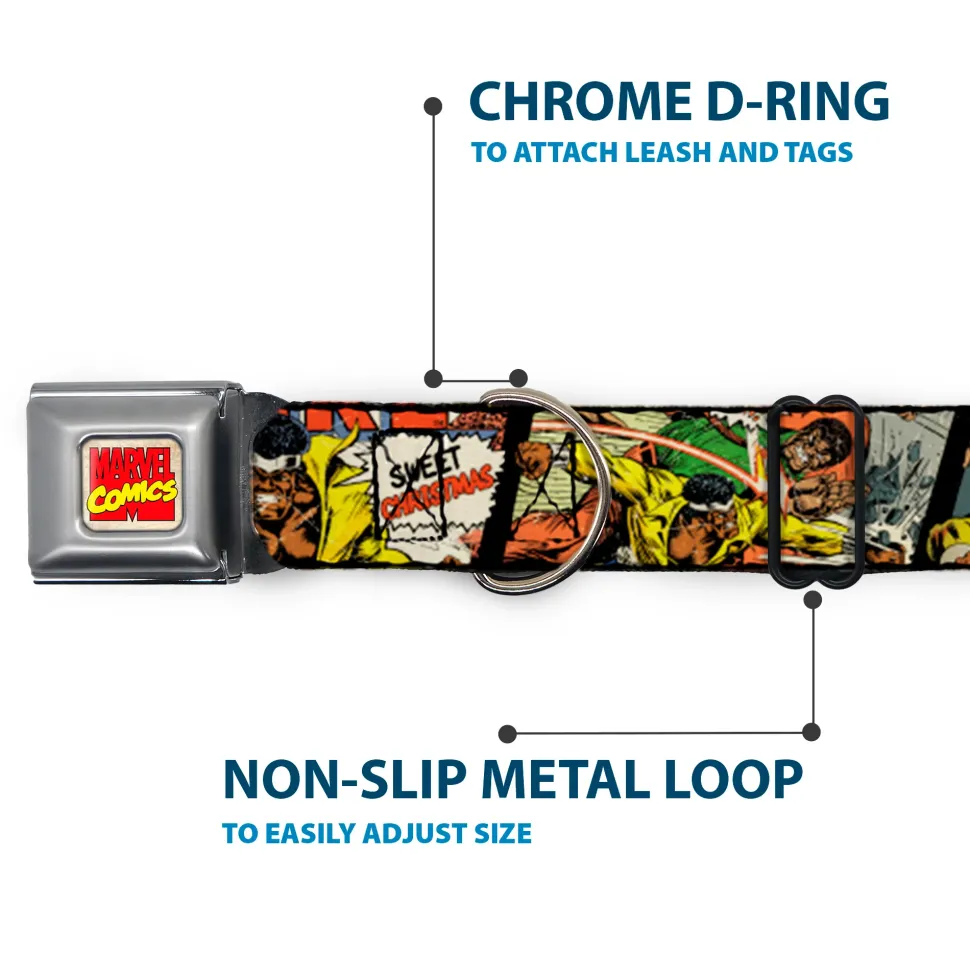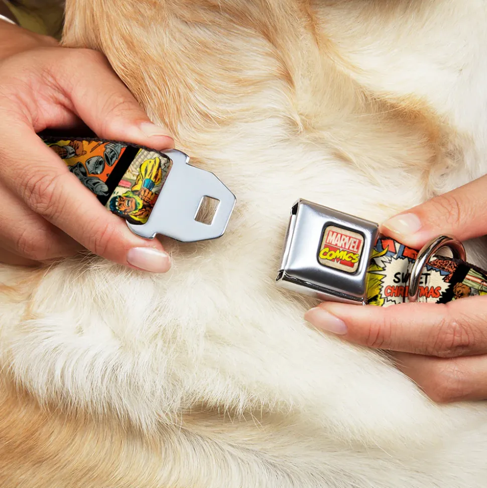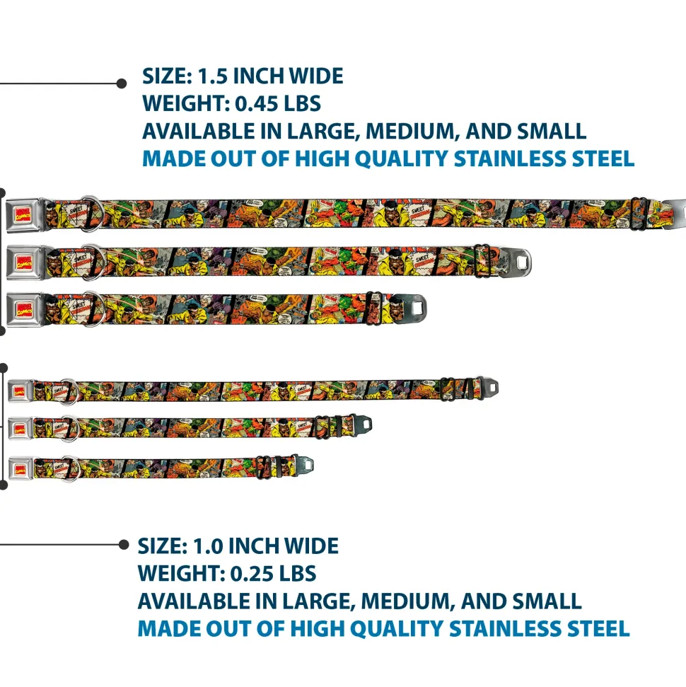 Your dog will be the talk of the town when people notice they’re wearing this awesome SeatBelt Dog Collar! Made from high-density polyester and durable steel components, this collar is built to last. It features beautiful vibrant artwork. The buckle is a miniature authentic SeatBelt Buckle, so you press the center button to release the clasp. This product is Made in USA by Buckle-Down Inc. and officially licensed by Marvel Comics.