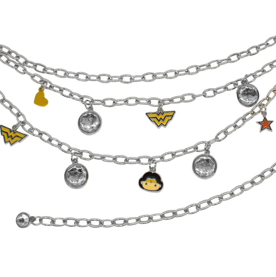 - This DC Comics Wonder Woman belt is made with a metal chain, enamel charms, and rhinestones.