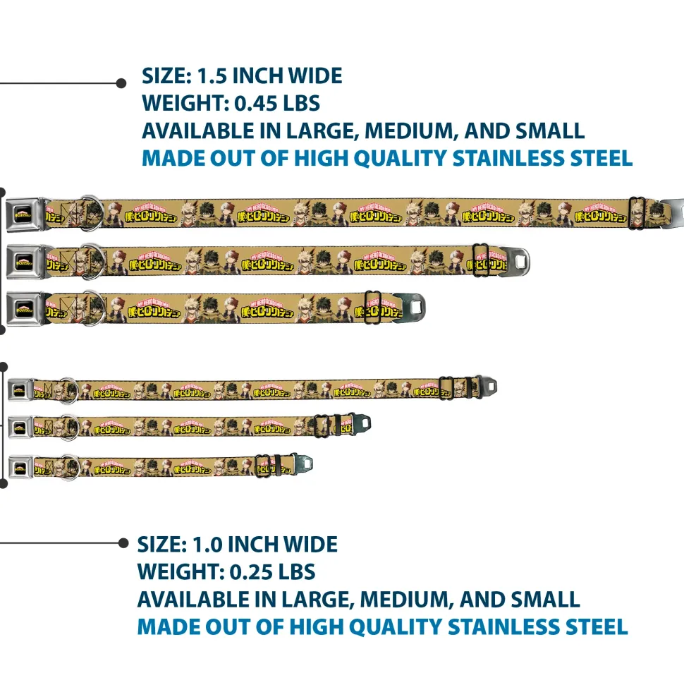 MY HERO ACADEMIA Title Logo Full Color Black Seatbelt Buckle Collar – MY HERO ACADEMIA Character Trio Pose and Title Logo Tan