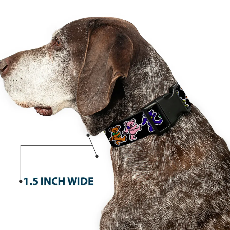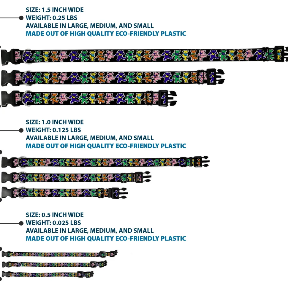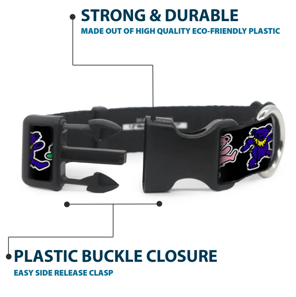 Vibrant and bold, this beautiful, polyester dog collar is made to show off your dog’s unique style through all the seasons. With an overengineered plastic buckle and strong D-ring, this durable collar can hold up to whatever your dog can dish out. This product is officially licensed by Grateful Dead.