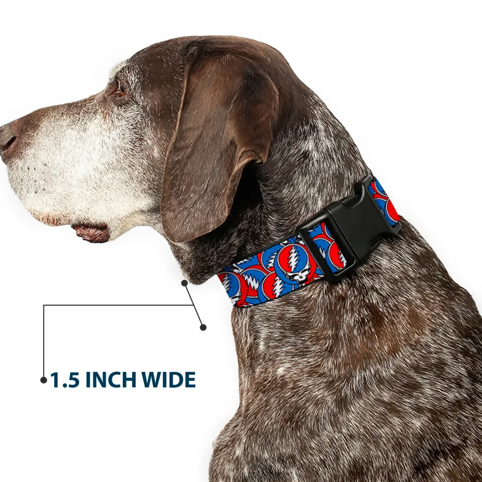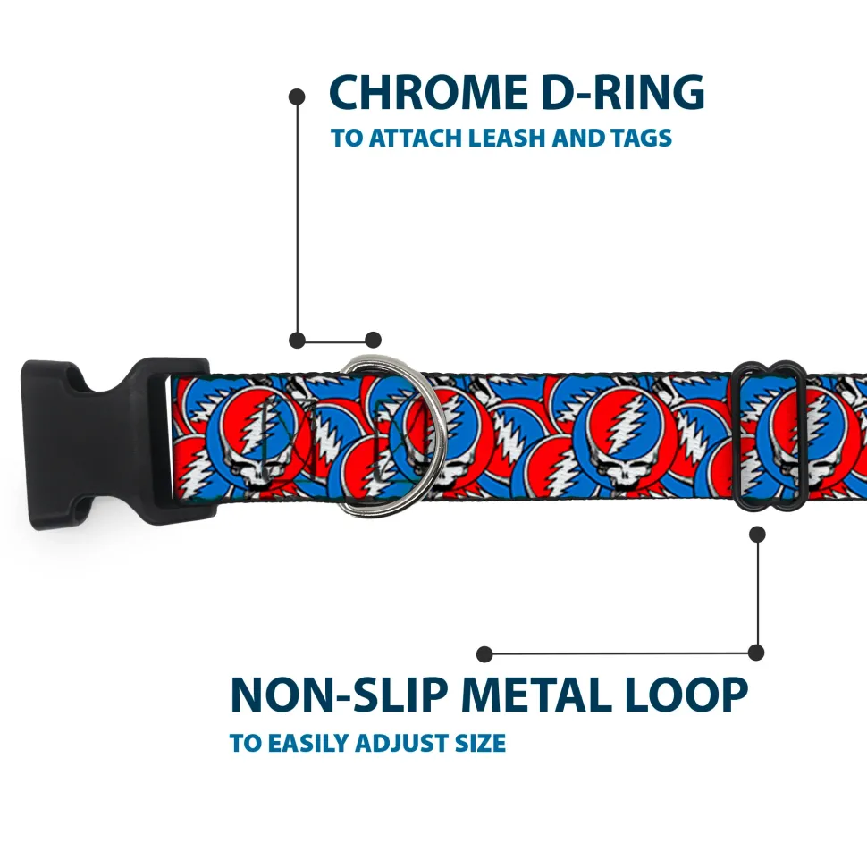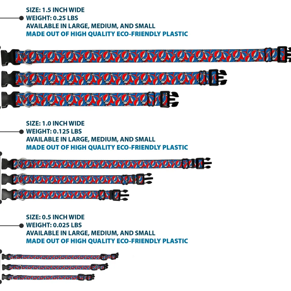 Vibrant and bold, this beautiful, polyester dog collar is made to show off your dog’s unique style through all the seasons. With an over engineered plastic buckle and strong D-ring, this durable collar can hold up to whatever your dog can dish out. This product is officially licensed by Grateful Dead.