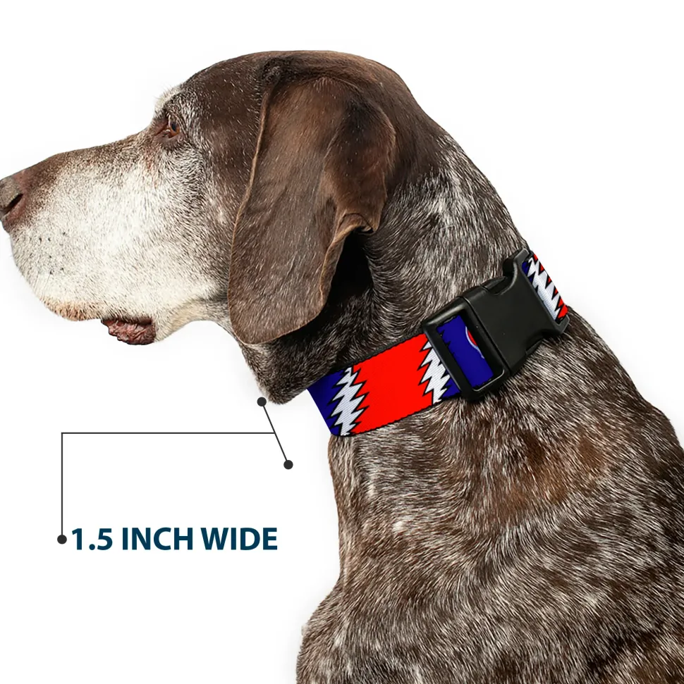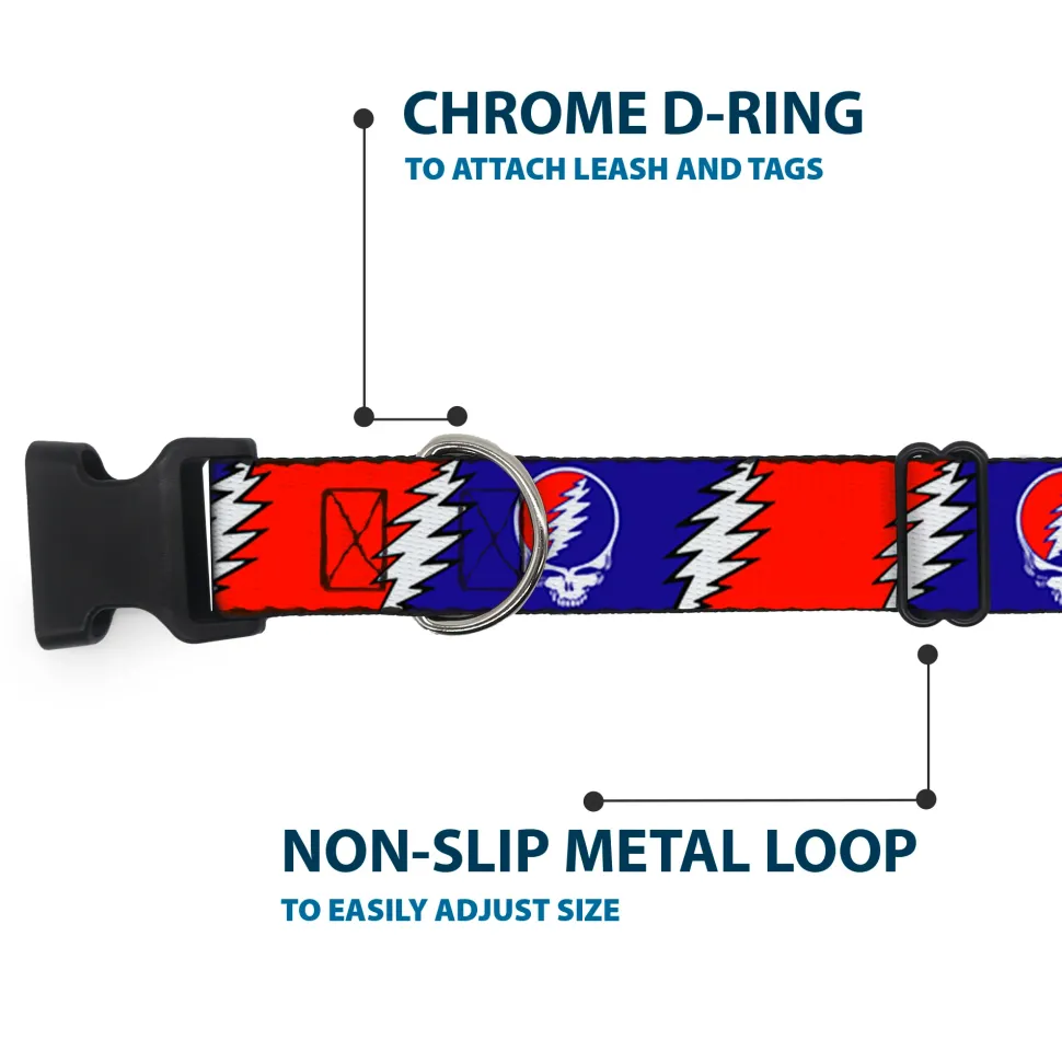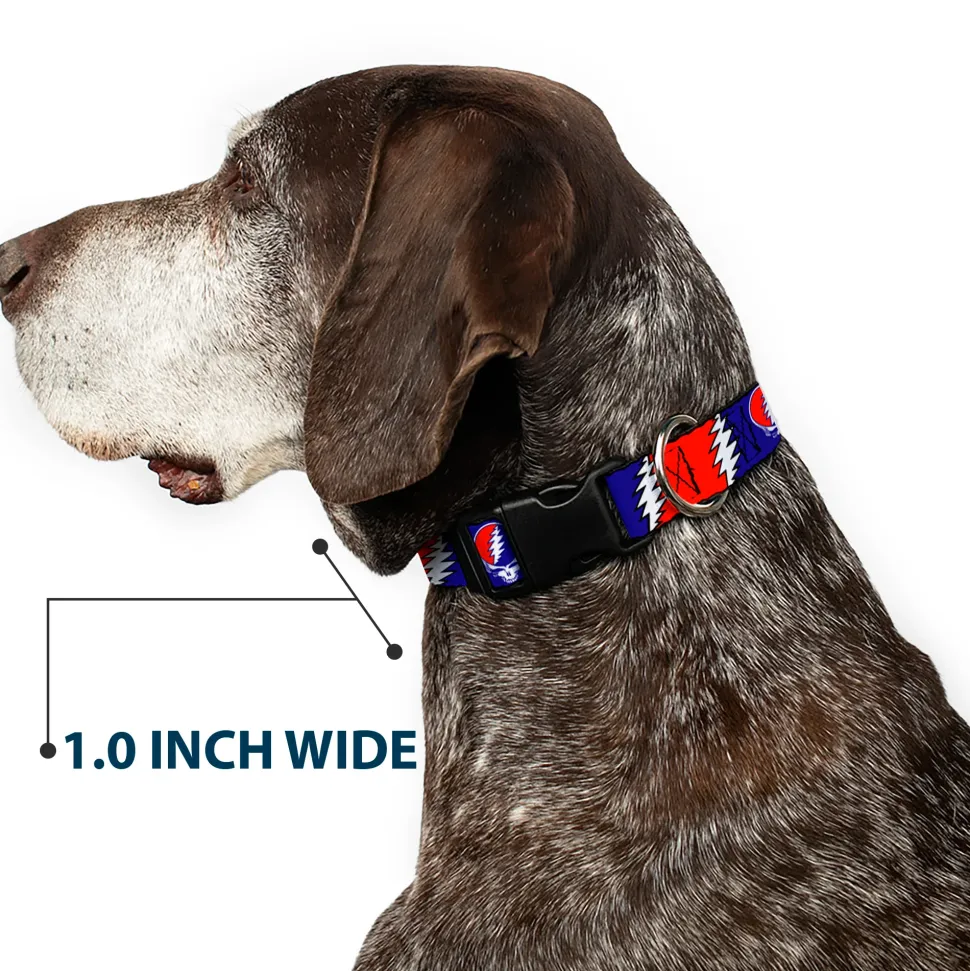 Vibrant and bold, this beautiful, polyester dog collar is made to show off your dog’s unique style through all the seasons. With an overengineered plastic buckle and strong D-ring, this durable collar can hold up to whatever your dog can dish out. This product is officially licensed by Grateful Dead.